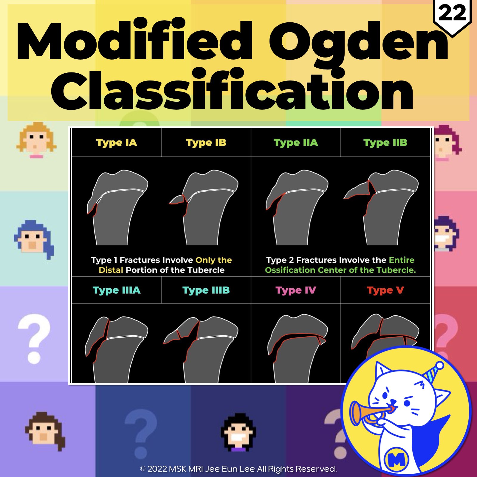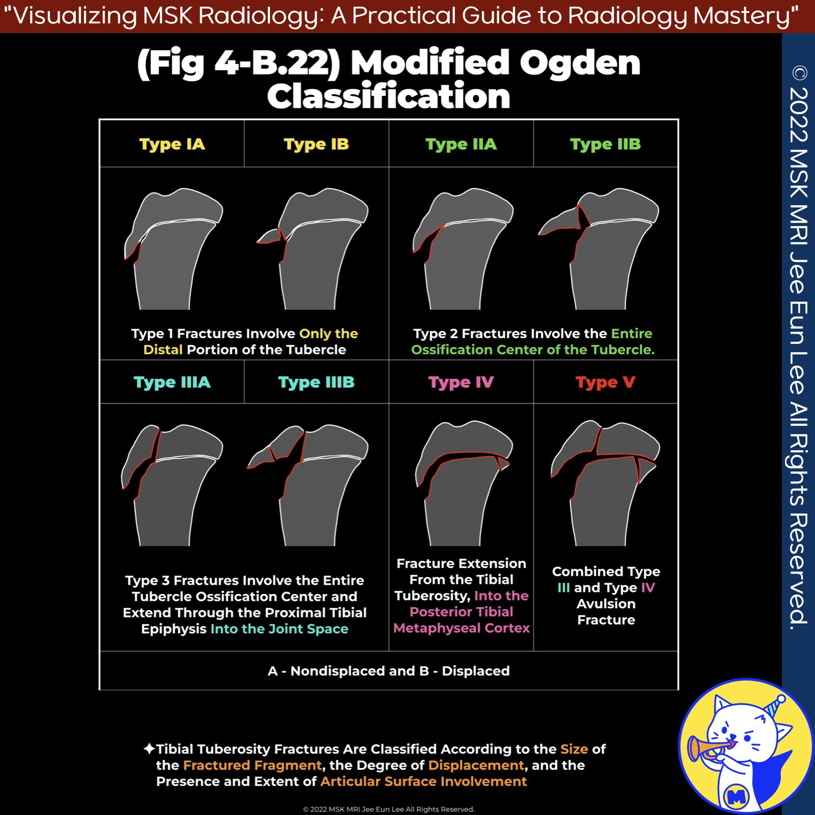 The Ogden classification system categorizes tibial tubercle fractures into five types, each with subtypes describing the fracture's extent and nature.