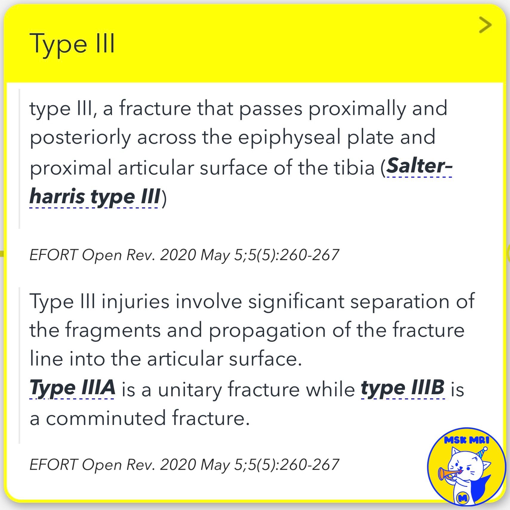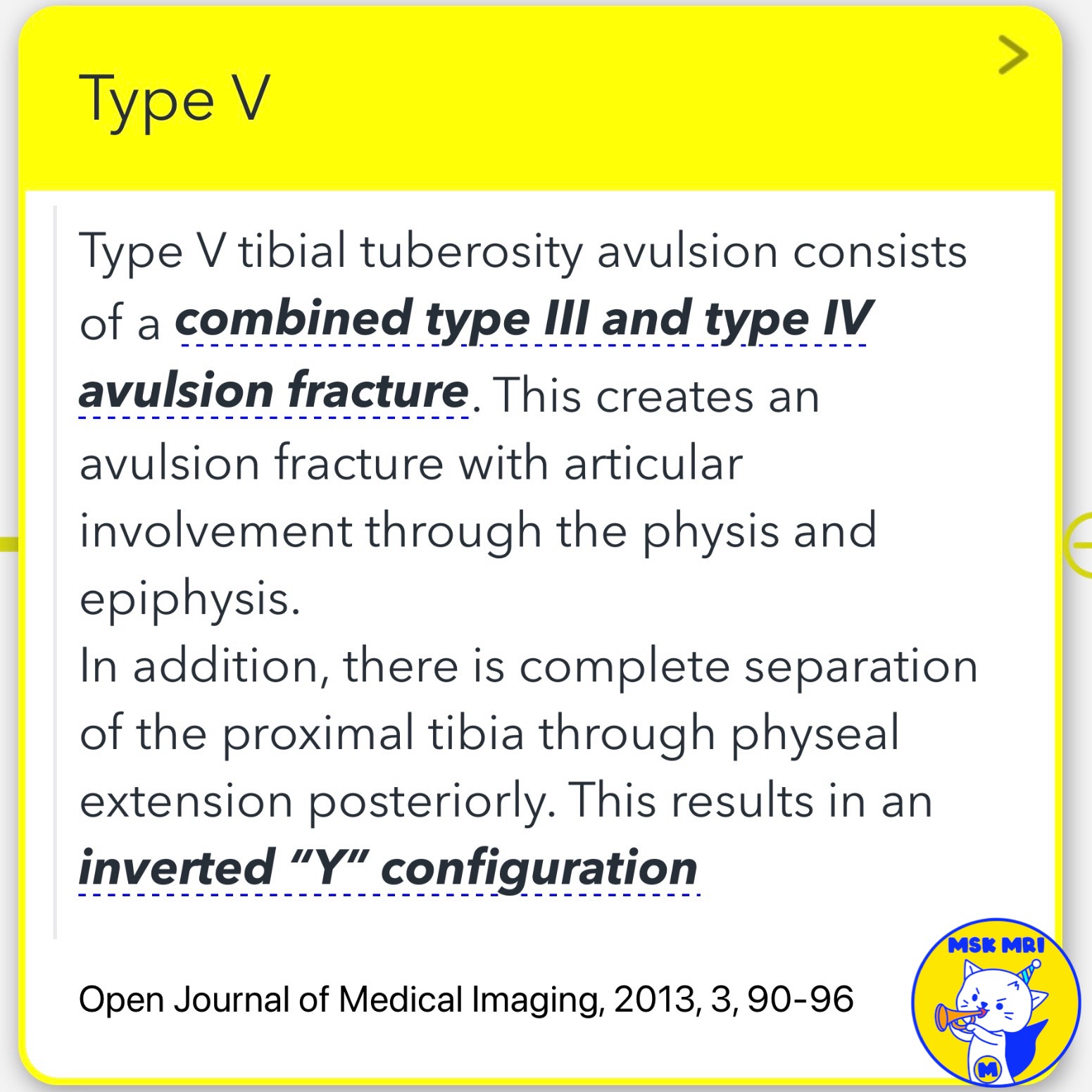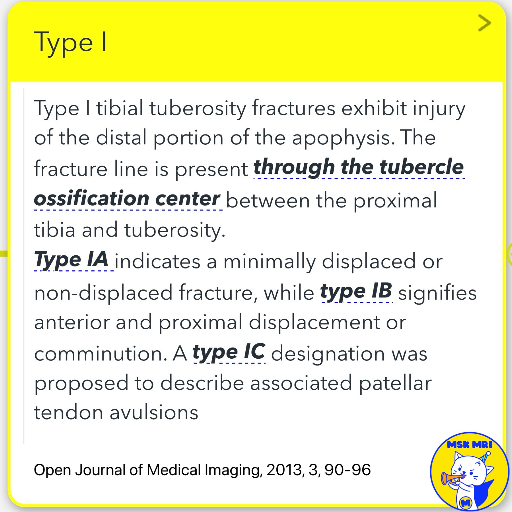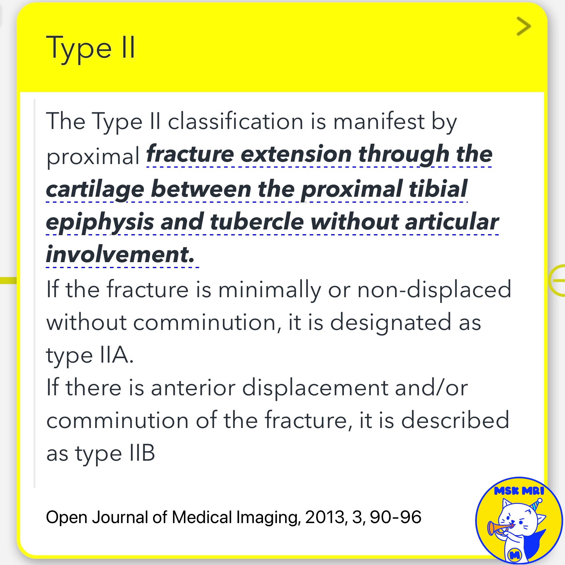 - Type IIA: Separation of the tubercle from the proximal tibia, minimally or non-displaced.