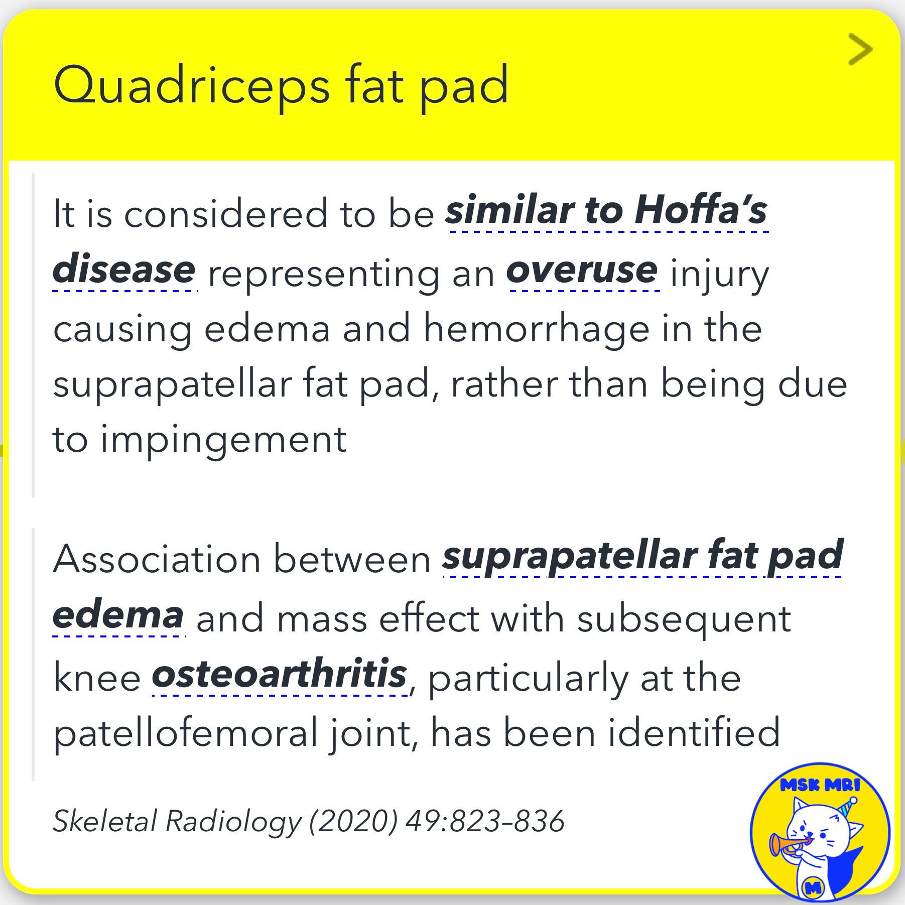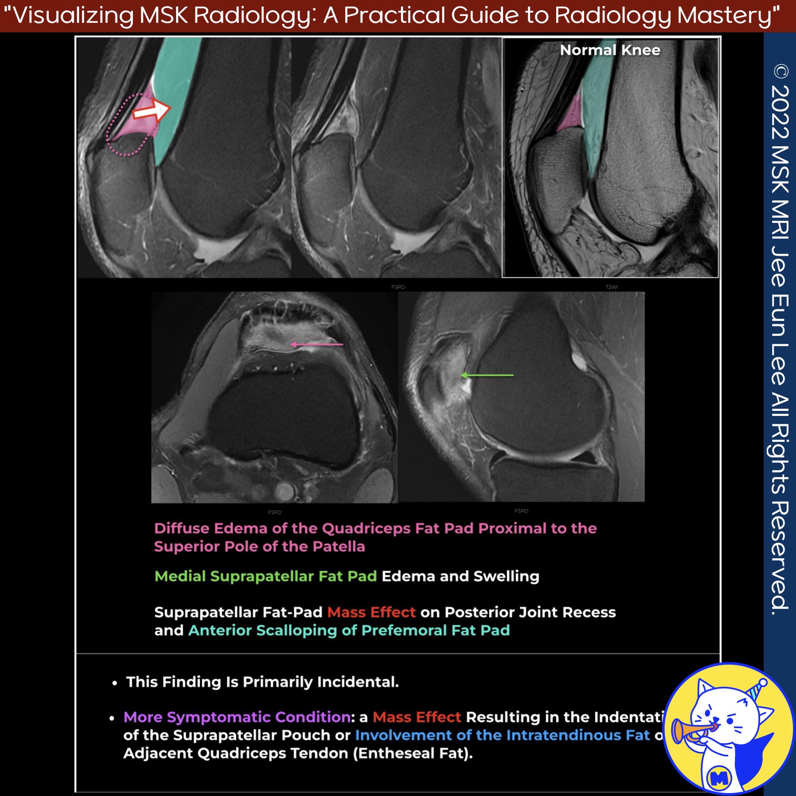 - Radiologists should assess the quadriceps fat pad for size, morphology, and signal intensity.
