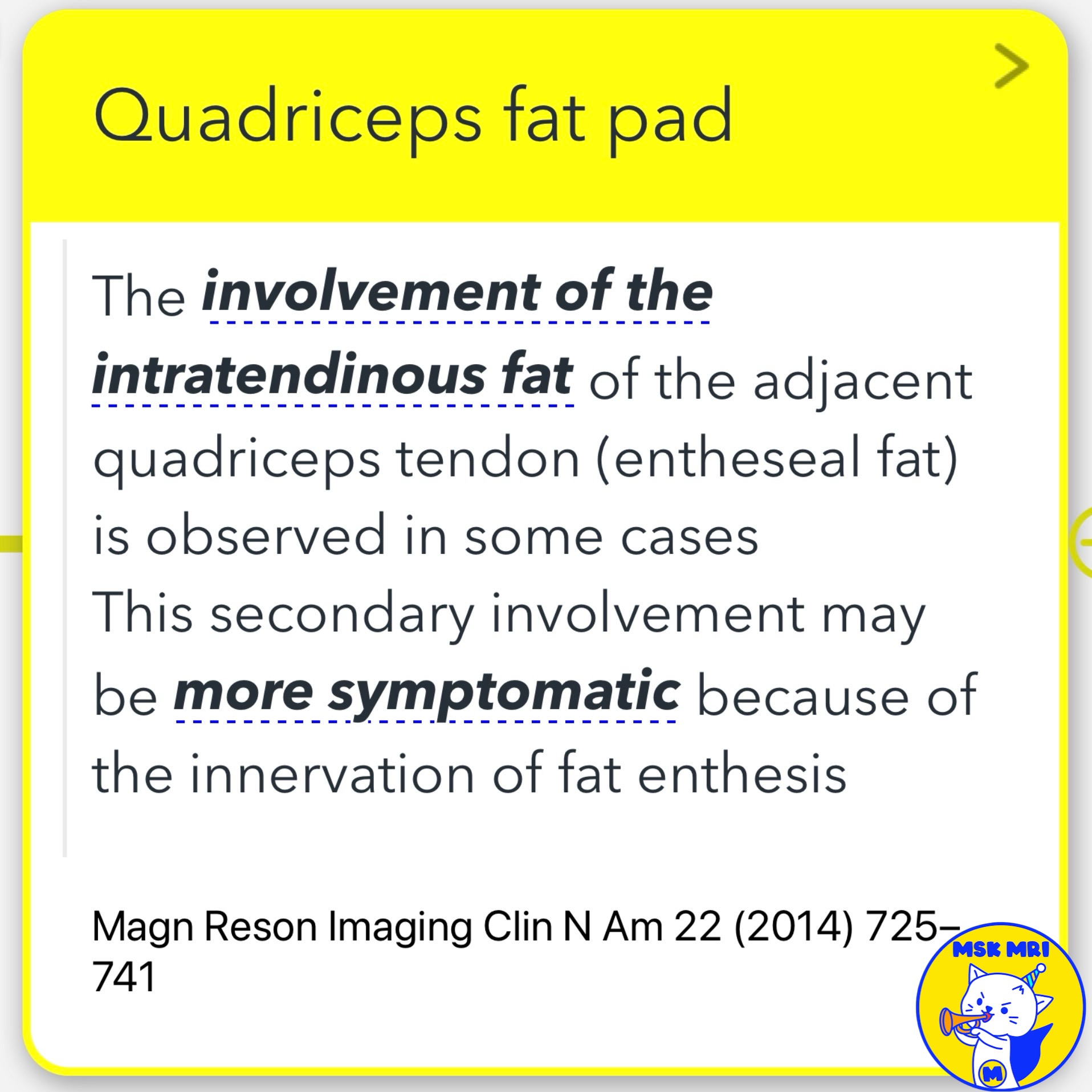 - In some cases, the intratendinous fat of the adjacent quadriceps tendon (entheseal fat) is involved, which may be more symptomatic due to the innervation of the fat enthesis (1).