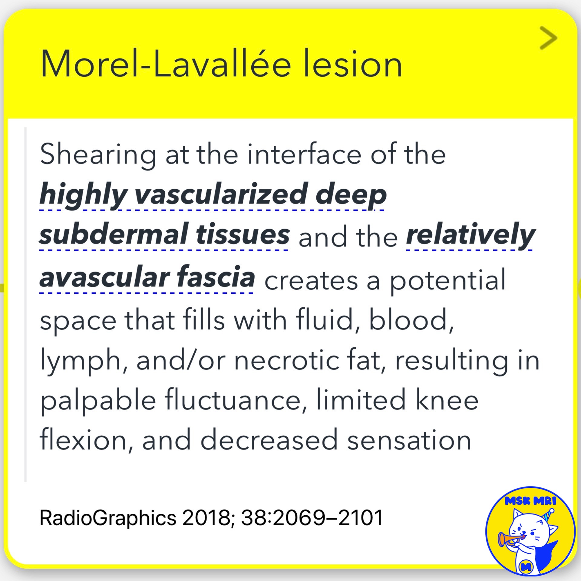 - A Morel-Lavallée lesion is a closed degloving injury that occurs when there is a shearing force between the subdermal tissues and the underlying fascia.
