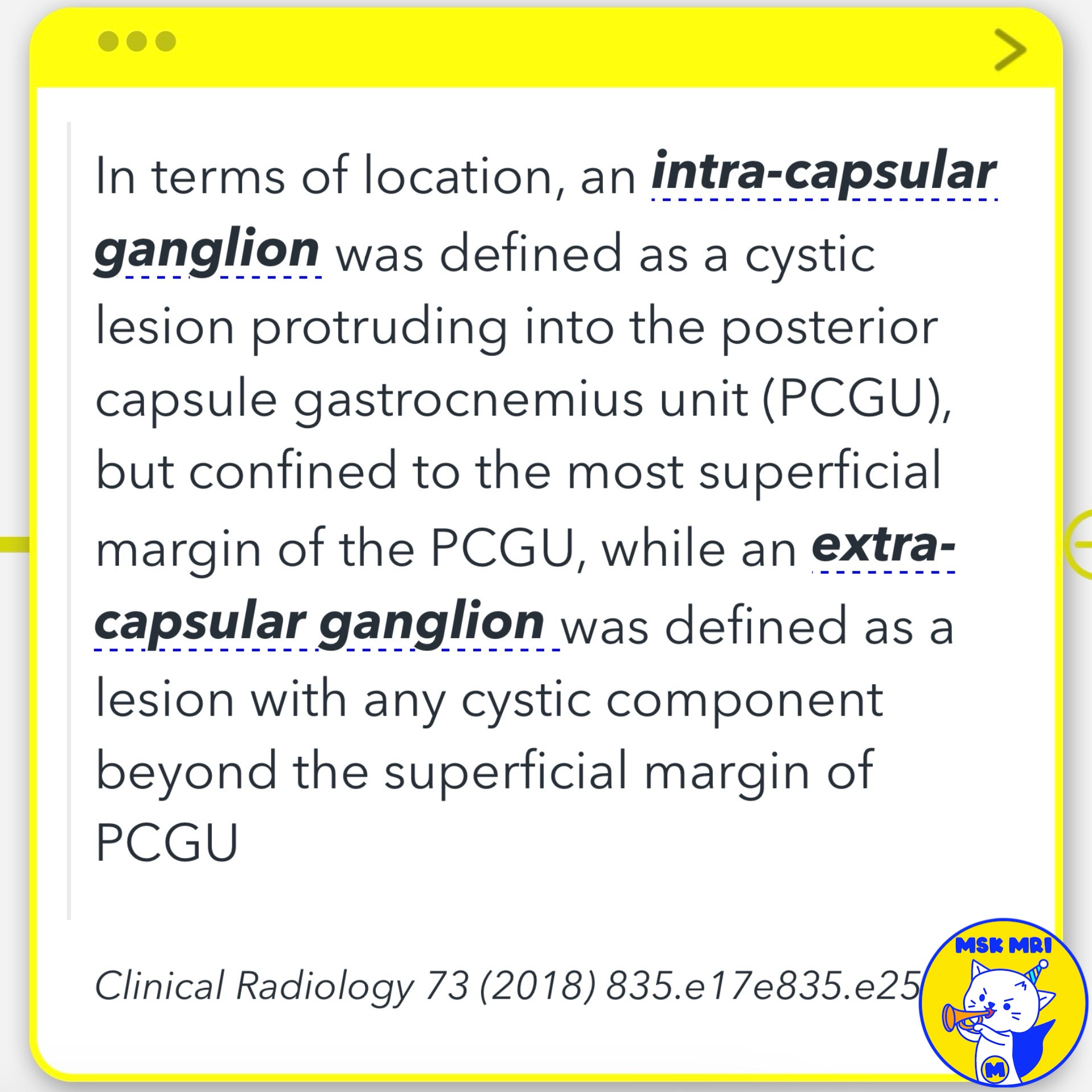 - Extra-capsular ganglia at the gastrocnemius origin are frequently observed on knee MRI.