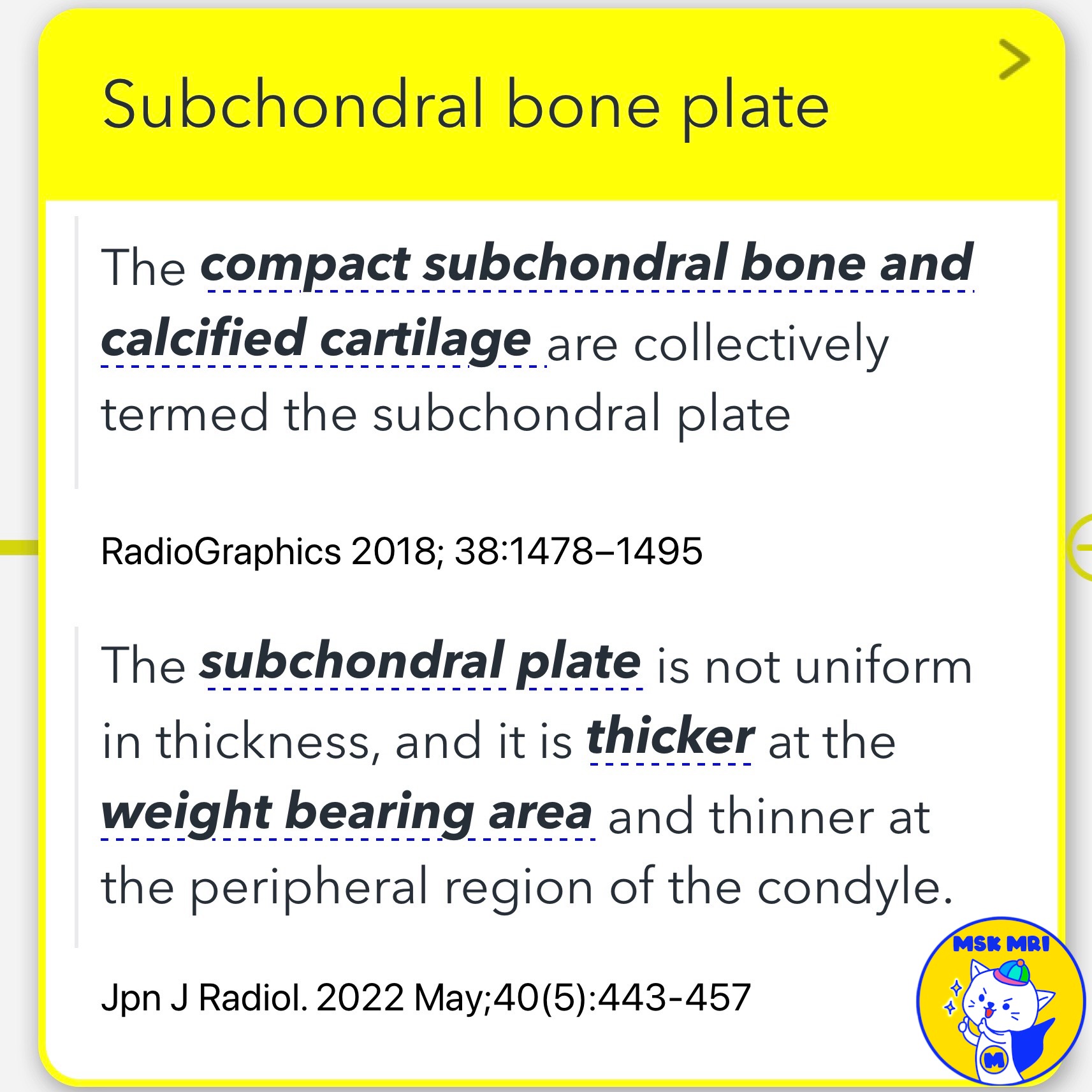 - In imaging, the calcified cartilage and subchondral bone appear as a single low-signal-intensity band, often referred to as the subchondral bone plate.