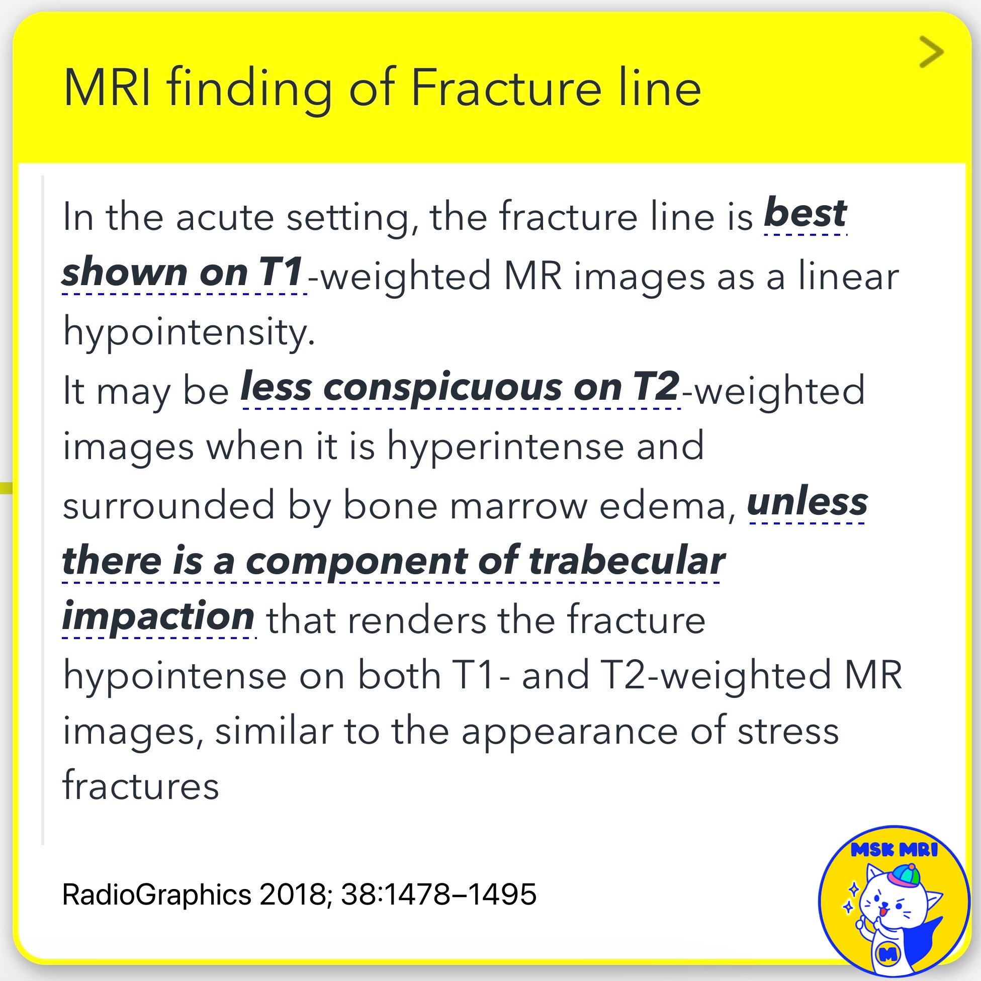 - Trabecular impaction causes the fracture to be hypointense on both T1- and T2-weighted MR images. This appearance is similar to stress fractures.