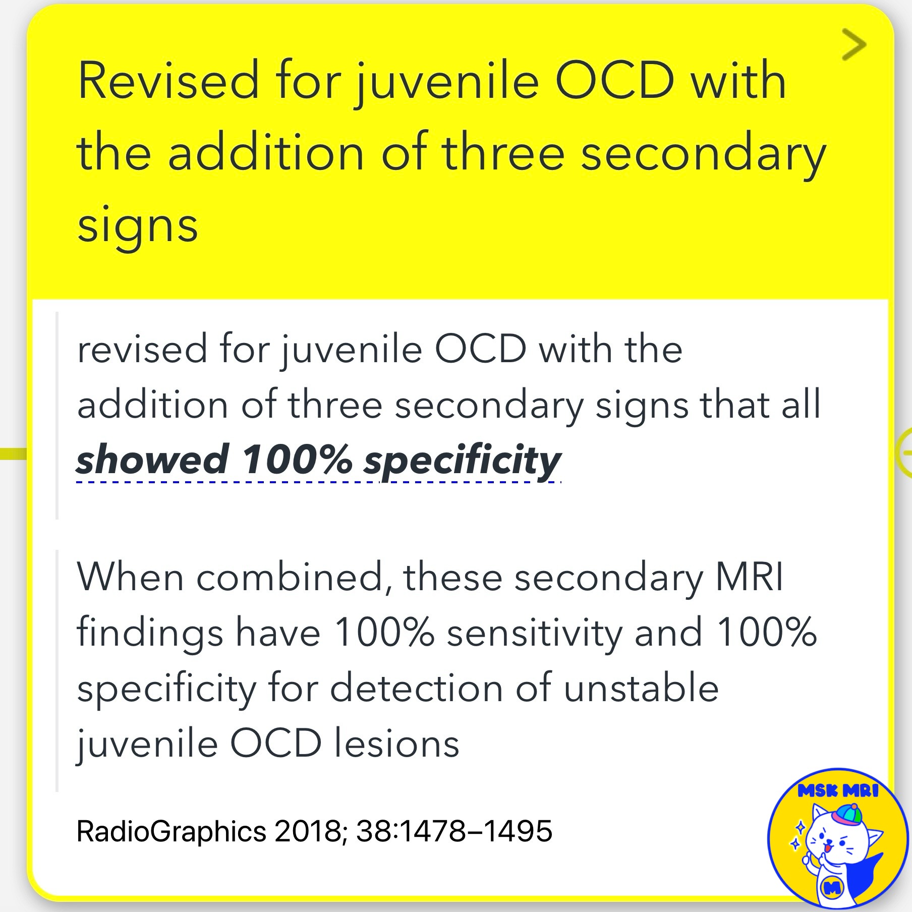 - When combined, these secondary MRI findings have 100% sensitivity and 100% specificity for the detection of unstable juvenile OCD lesions.
