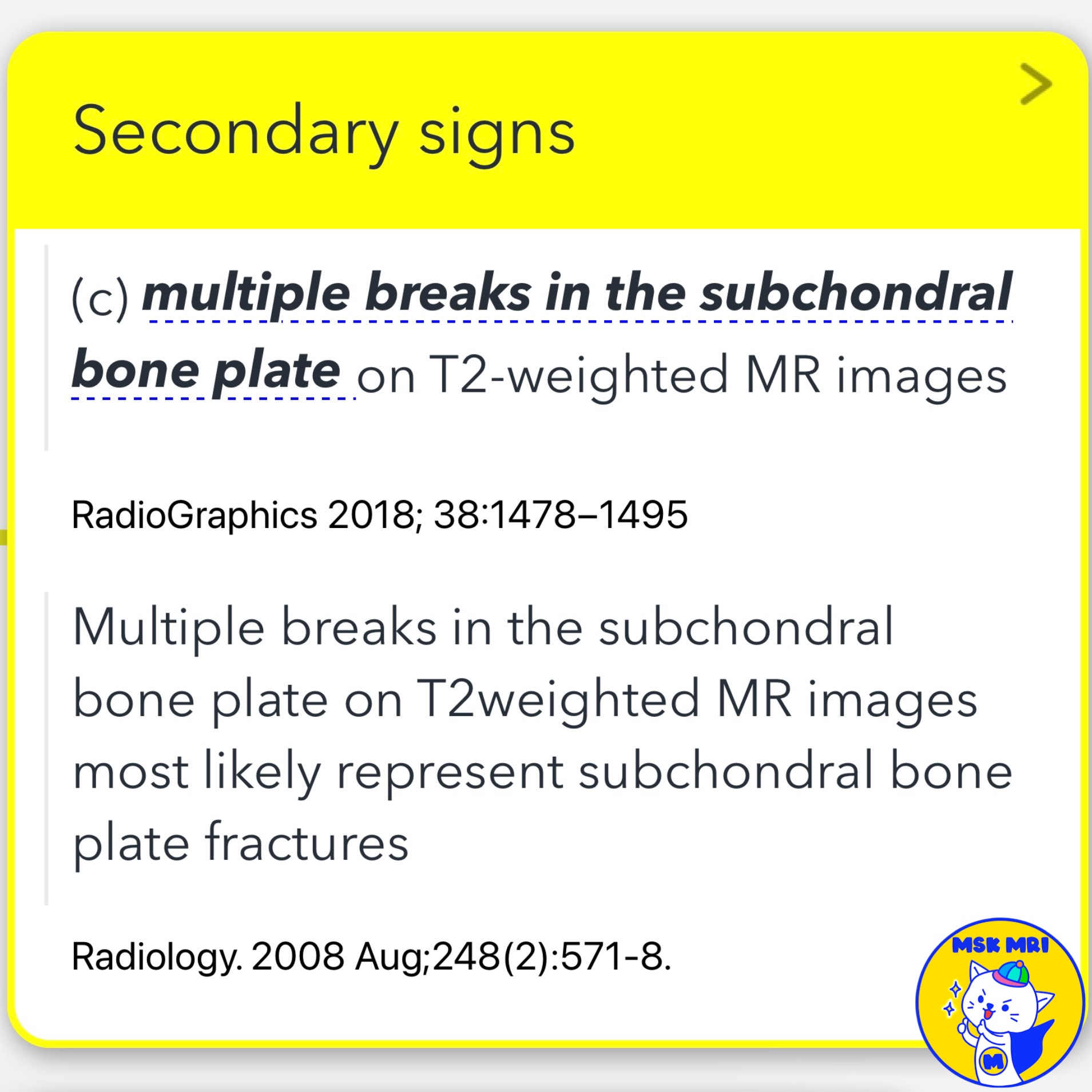 - Multiple breaks in the subchondral bone plate on T2-weighted MR images most likely represent subchondral bone plate fractures.