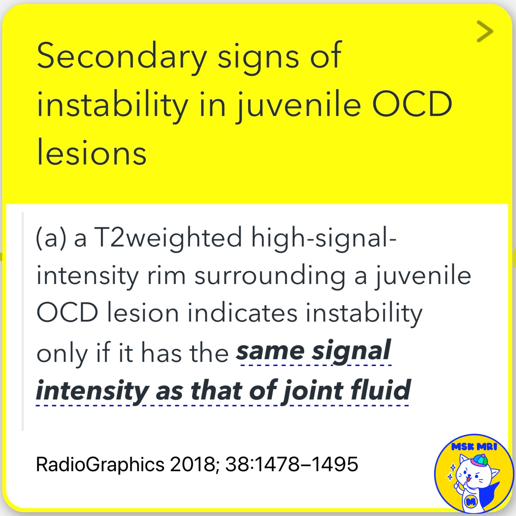 - A T2-weighted high-signal-intensity rim surrounding a juvenile OCD lesion indicates instability only if it has the same signal intensity as that of joint fluid.