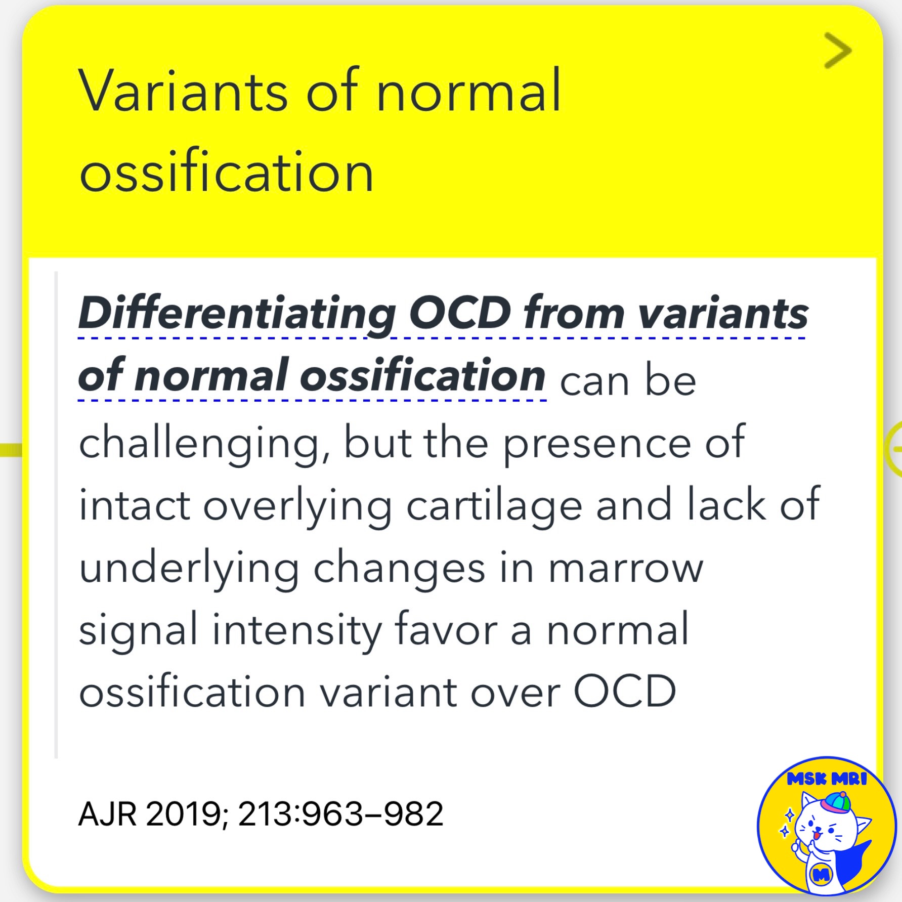 - However, the presence of intact overlying cartilage and a lack of underlying changes in marrow signal intensity favor a normal ossification variant over OCD.