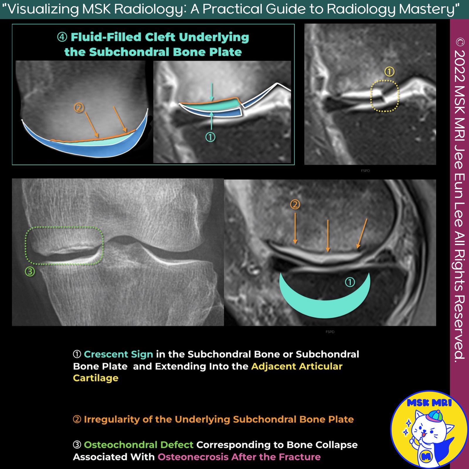 - Observation: A crescent sign marked in aqua color in the subchondral bone or subchondral bone plate, extending into the adjacent articular cartilage.