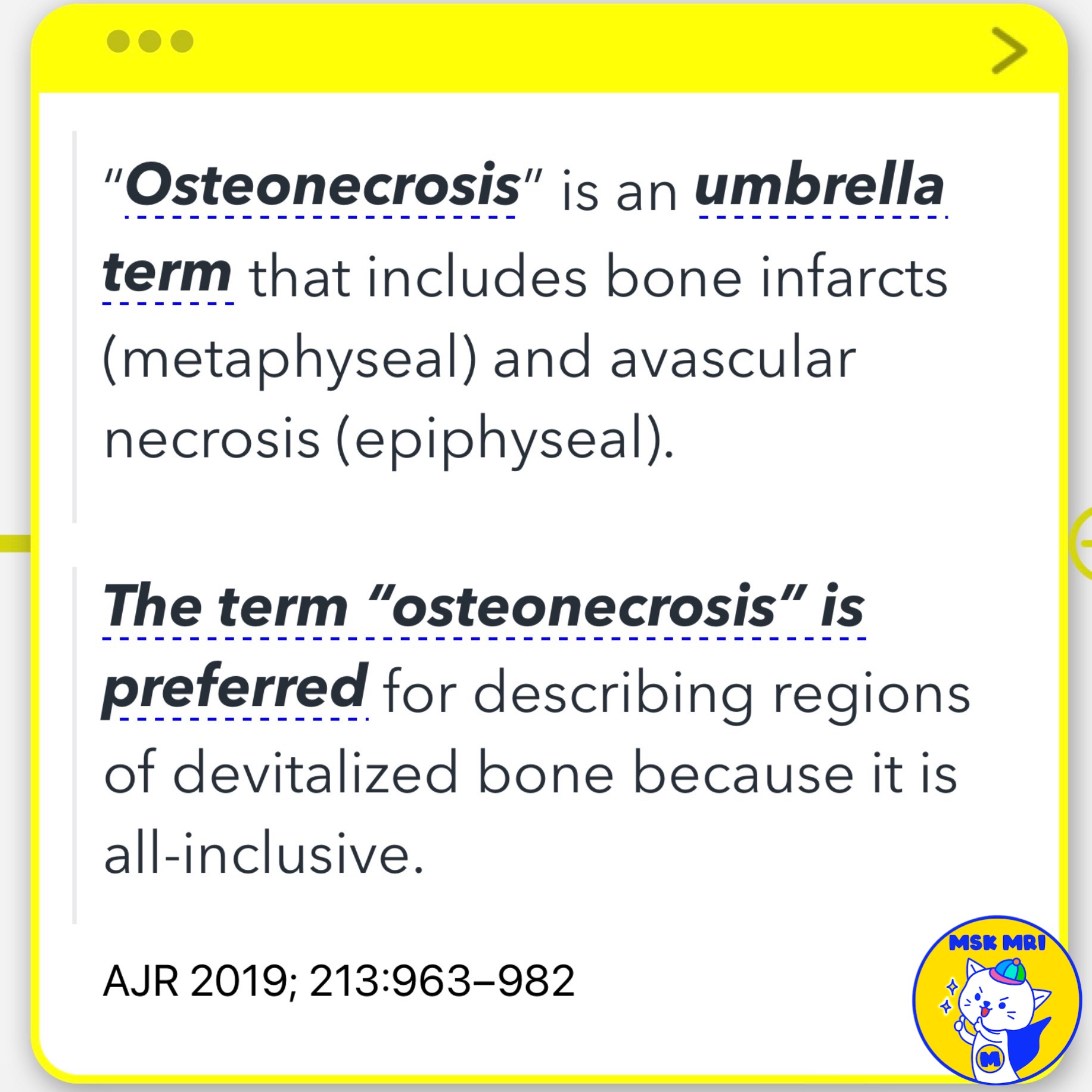 - Osteonecrosis is an umbrella term that includes bone infarcts (metaphyseal) and avascular necrosis (epiphyseal).