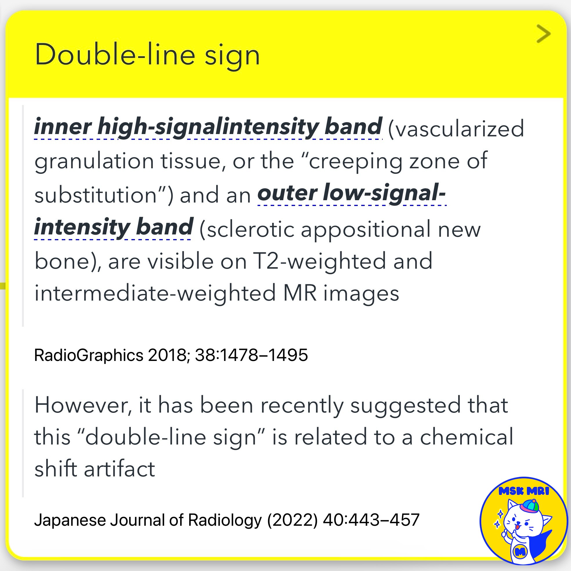 - It consists of an inner high-signal intensity band (vascularized granulation tissue, or the “creeping zone of substitution”) and an outer low-signal intensity band (sclerotic appositional new bone).