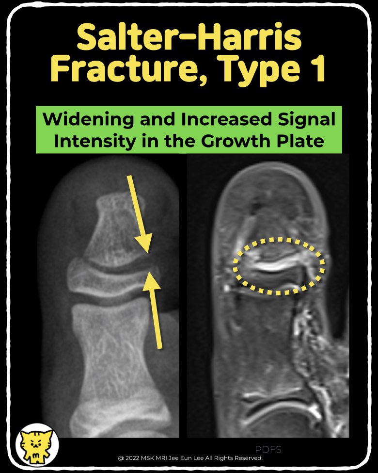 - Salter-Harris Type I fractures involve a fracture through the growth plate (physis) without bone involvement, often challenging to detect on radiographs. MRI is valuable for assessing physeal injuries, especially when radiographs are inconclusive.