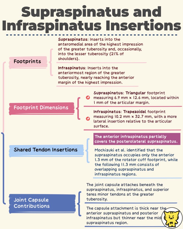 - Infraspinatus: Trapezoidal footprint measuring 10.2 mm × 32.7 mm, with a more lateral insertion relative to the articular surface.