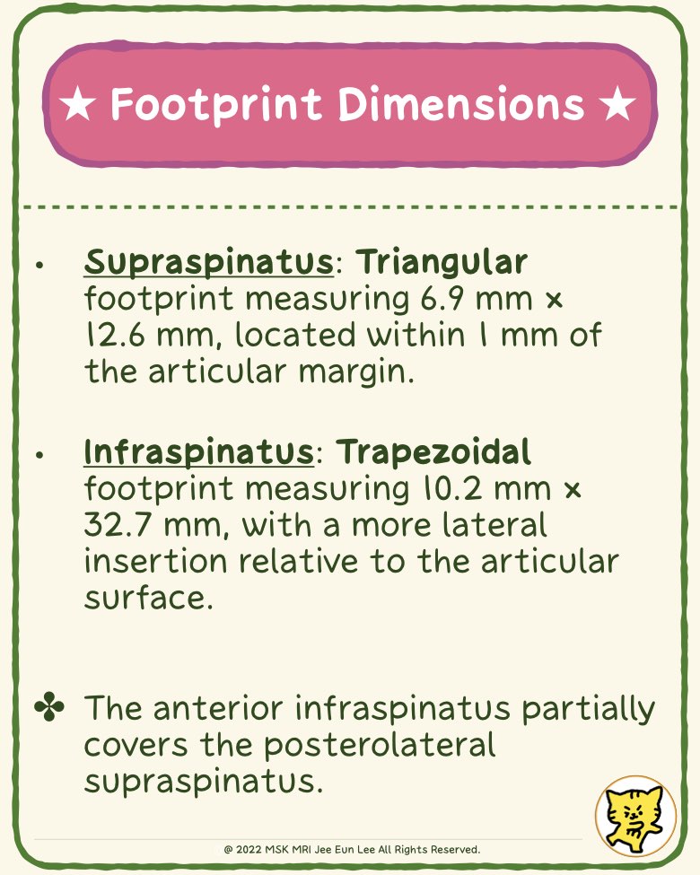 - Supraspinatus: Triangular footprint measuring 6.9 mm × 12.6 mm, located within 1 mm of the articular margin.