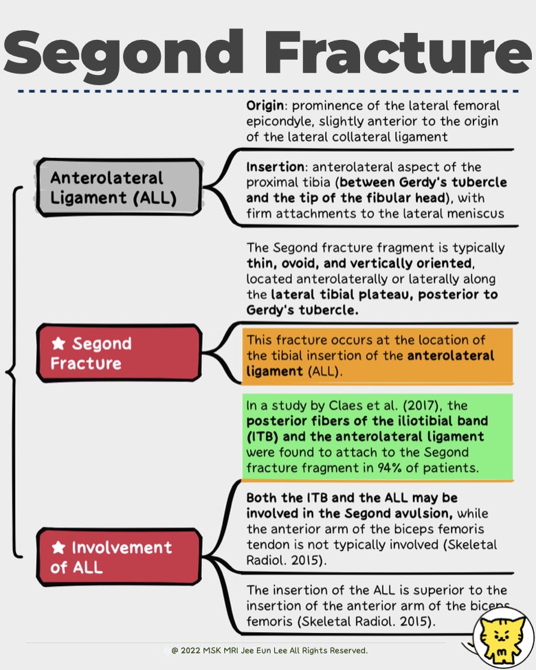 - Caterine et al. (2016) reported that while MRI was unable to identify a distinct ligamentous attachment, the Segond fracture occurred at the location of the tibial insertion of the ALL, as described in the literature.