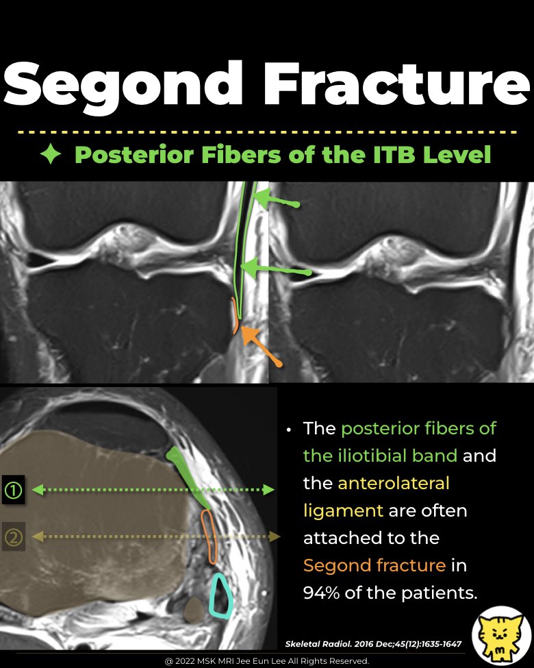 - In a study by Claes et al. (2017), the posterior fibers of the iliotibial band (ITB) and the lateral capsule (the anterolateral ligament) were found to attach to the Segond fracture fragment in 94% of patients.