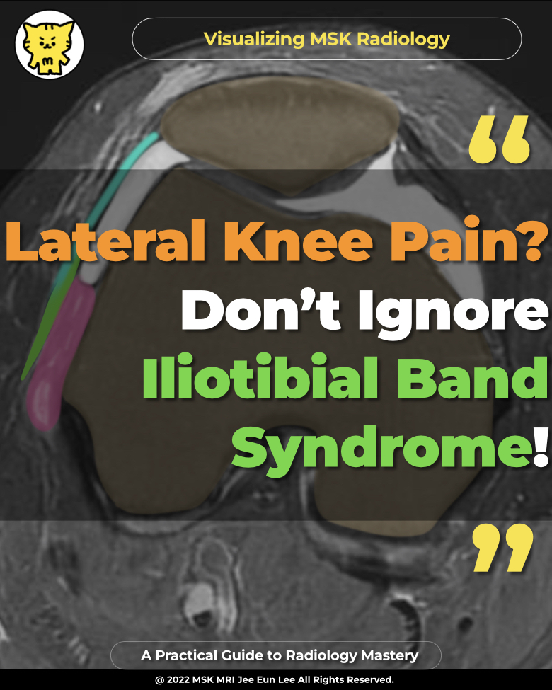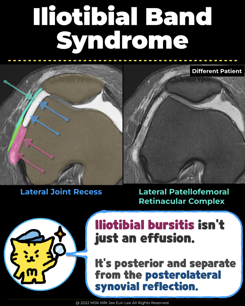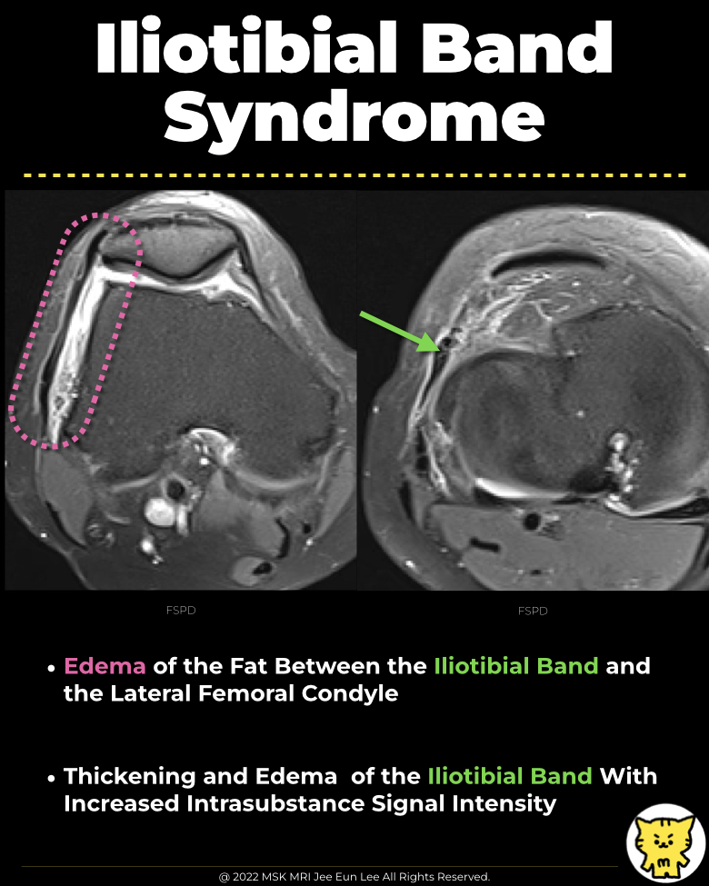 - MRI often shows ill-defined high T2 signal intensity or edema within a compartment-like space bounded laterally by the iliotibial tract and medially by the lateral femoral condyle, lateral meniscus, and meniscocapsular ligaments.