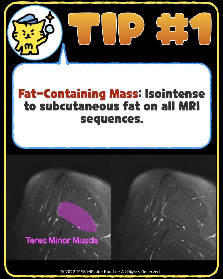 - Fat-Containing Mass: Isointense to subcutaneous fat in all sequences.
