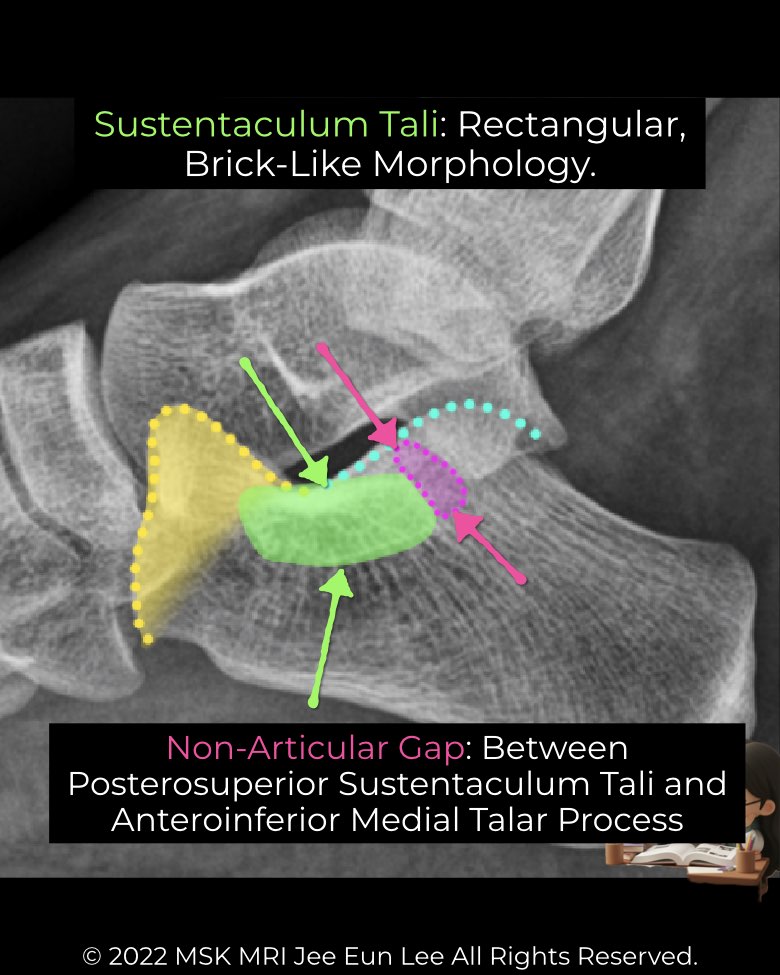 - Sustentaculum tali appears brick-shaped on lateral X-ray