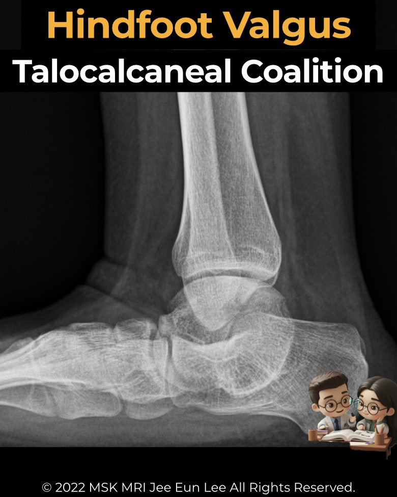 • Broad lateral talar process from valgus stress. - CT/MRI: Define coalition type, assess valgus angle, detect impingement. MRI may underestimate valgus due to non–weight-bearing position.