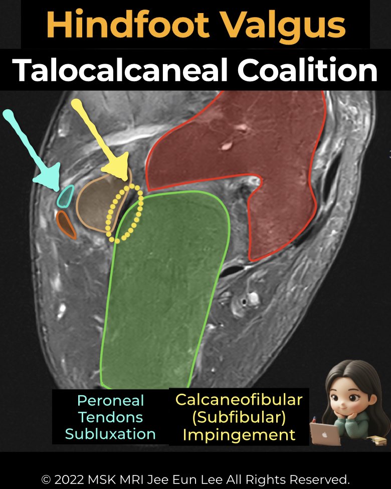• MRI: subcortical edema, cysts, sclerosis at impingement sites. - Peroneal Tendon Instability: Subluxation/dislocation from valgus malalignment and overactive peroneus brevis.