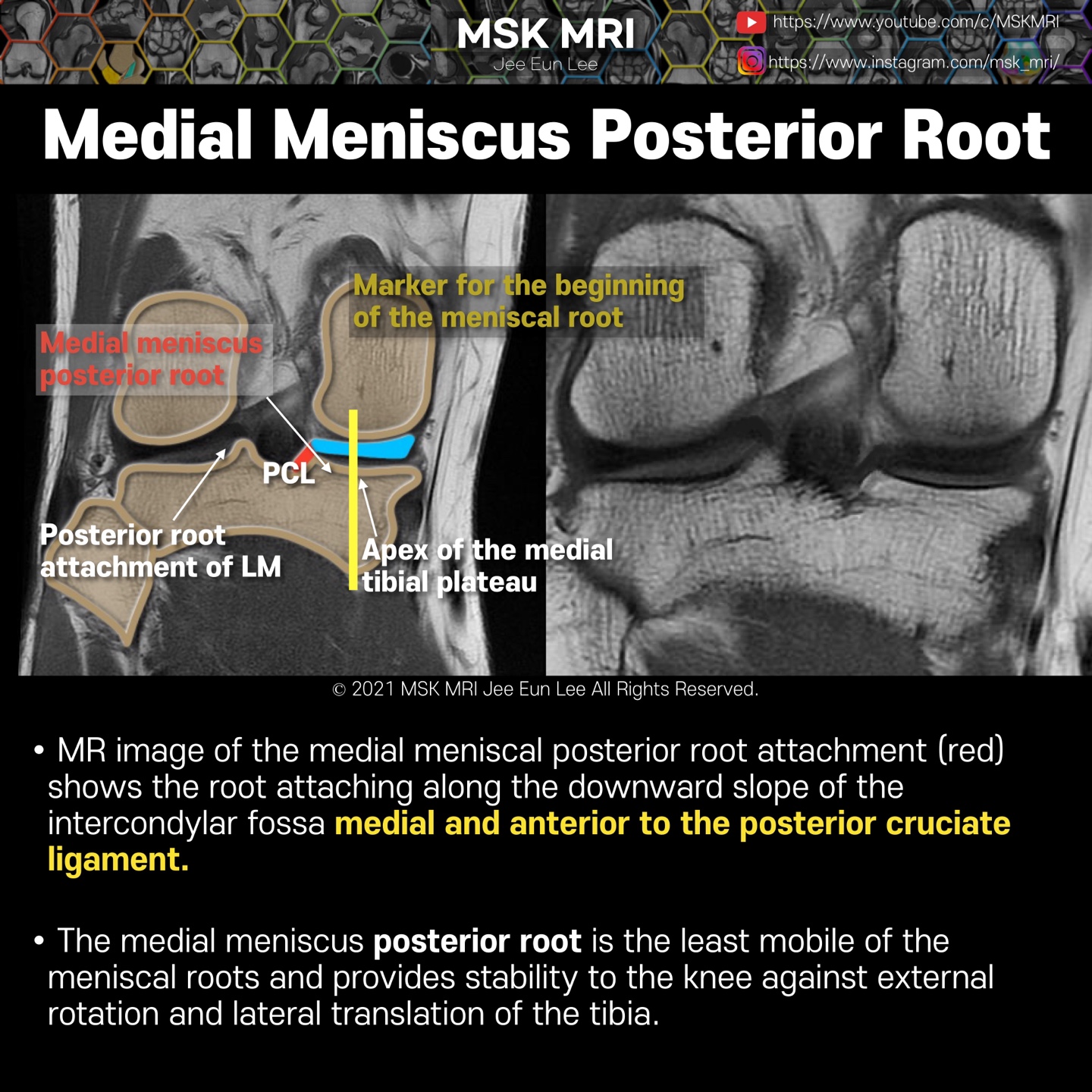 The root attaches along the downward slope of the intercondylar fossa medial and anterior to the posterior cruciate ligament.