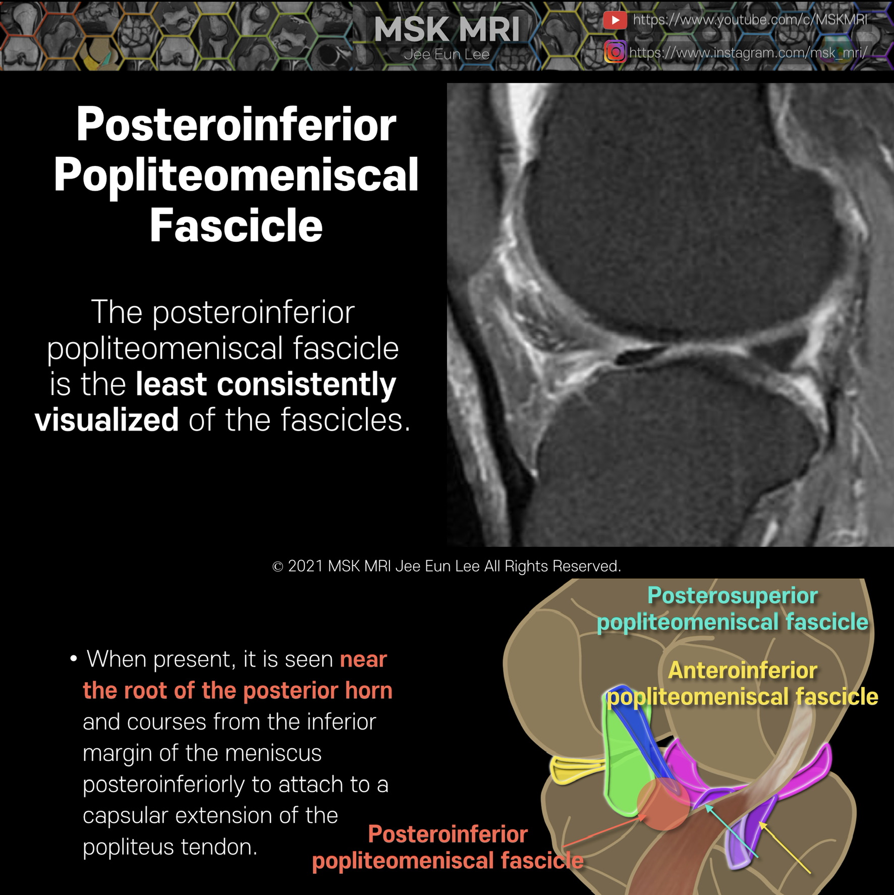 The posteroinferior fascicle is more medially located, and extends from a medial aponeurotic extension of the popliteus tendon to attach to the lateral meniscus near the attachment of the meniscofemoral ligaments.