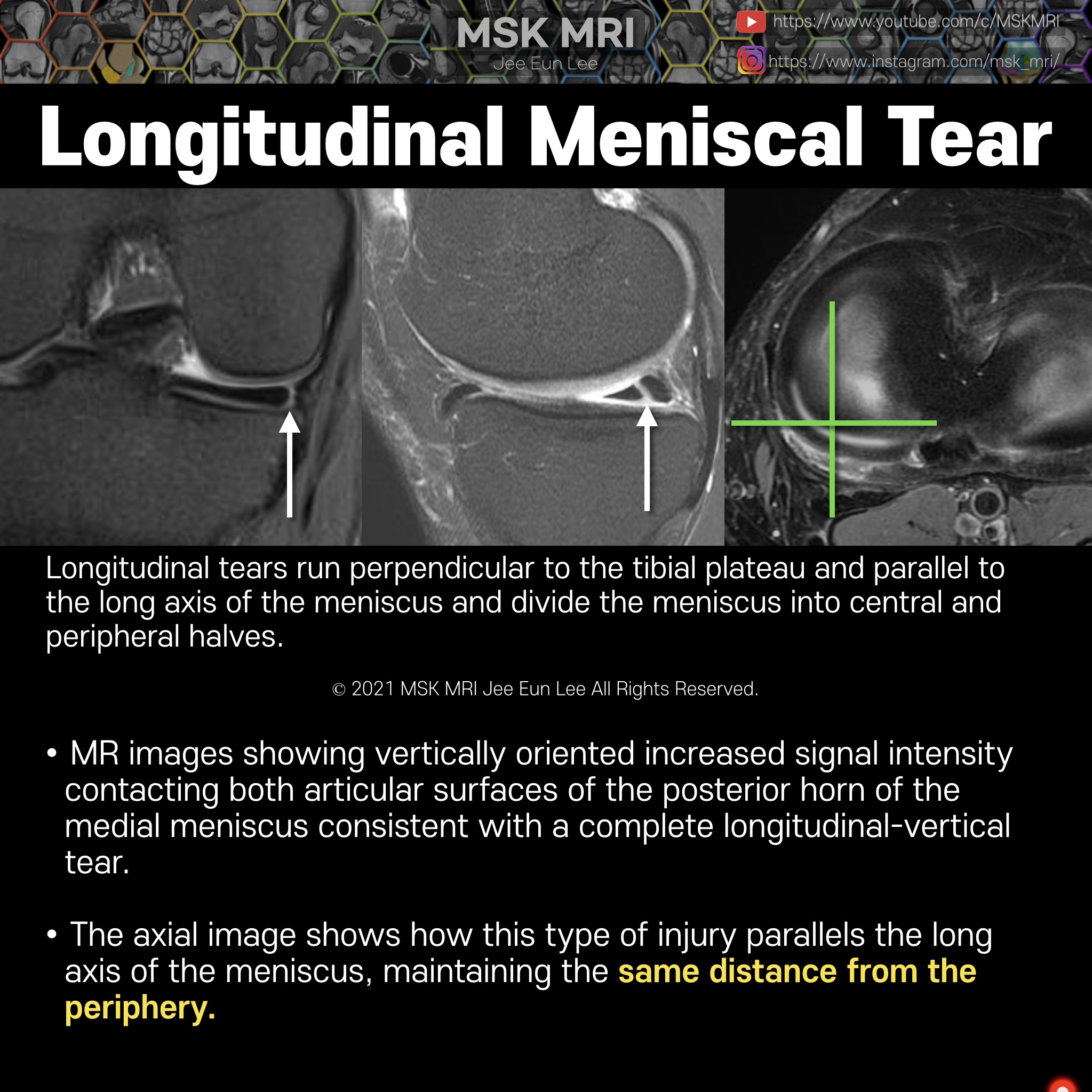 The axial image shows how this type of injury parallels the long axis of the meniscus, maintaining the same distance from the periphery.