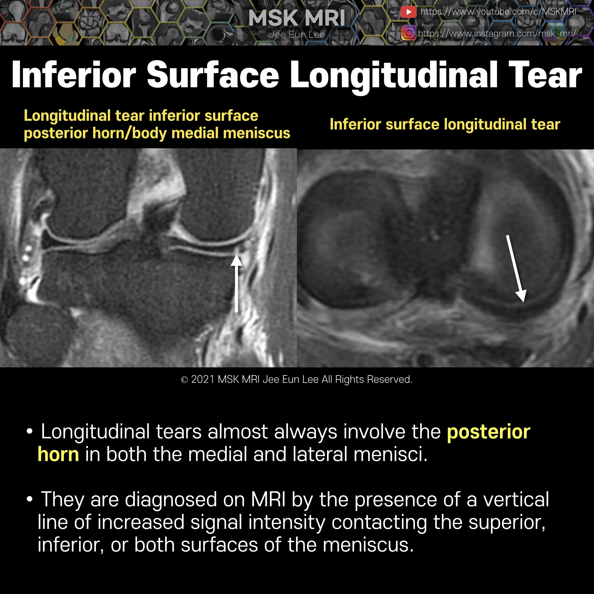 Longitudinal tears are diagnosed on MRI by the presence of a vertical line of increased signal intensity contacting the superior, inferior, or both surfaces of the meniscus.