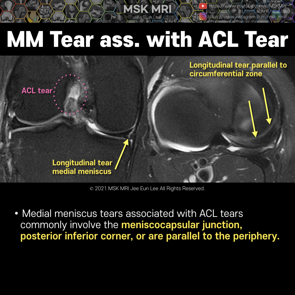 Medial meniscus tears associated with ACL tears commonly involve the meniscocapsular junction, posterior inferior corner, or are parallel to the periphery.