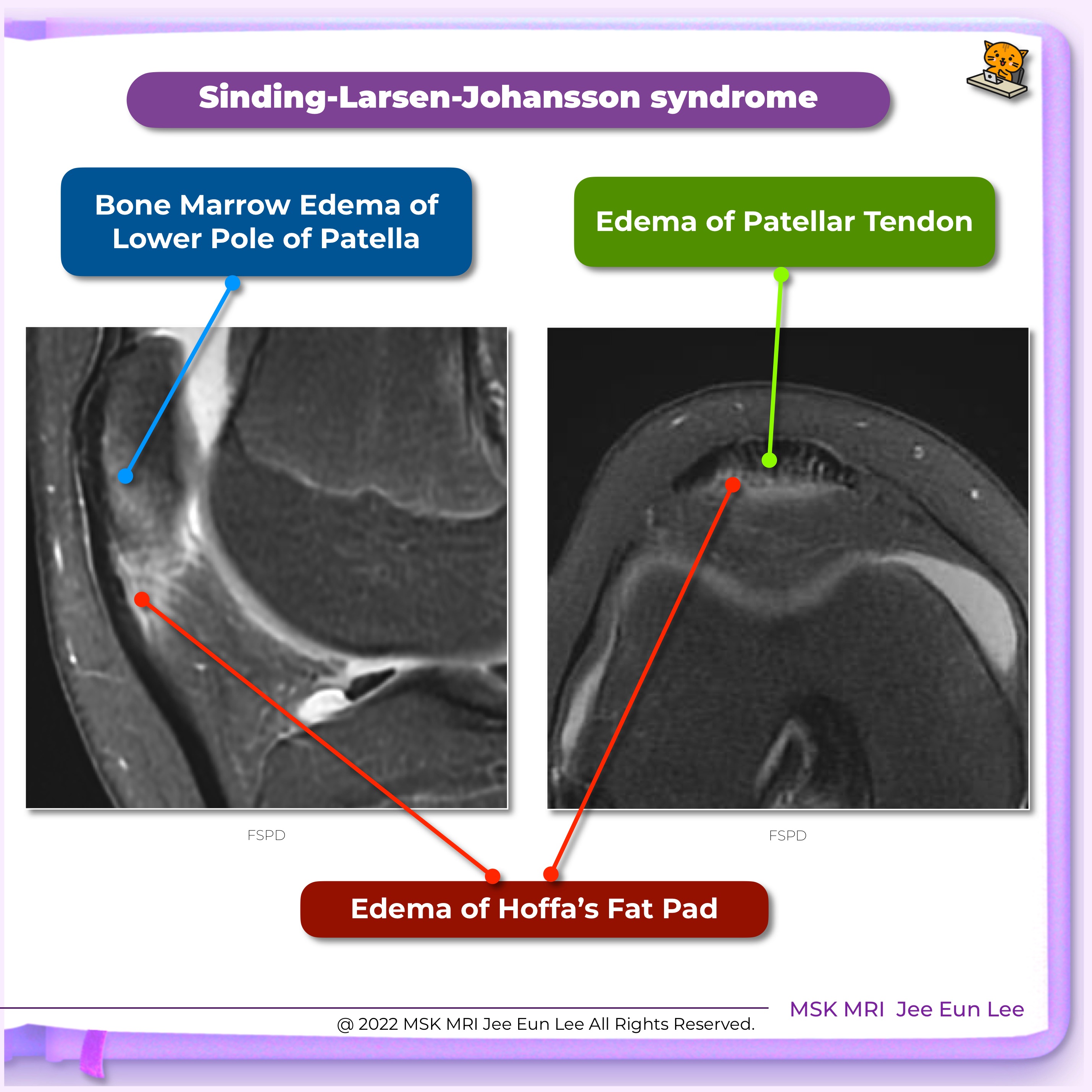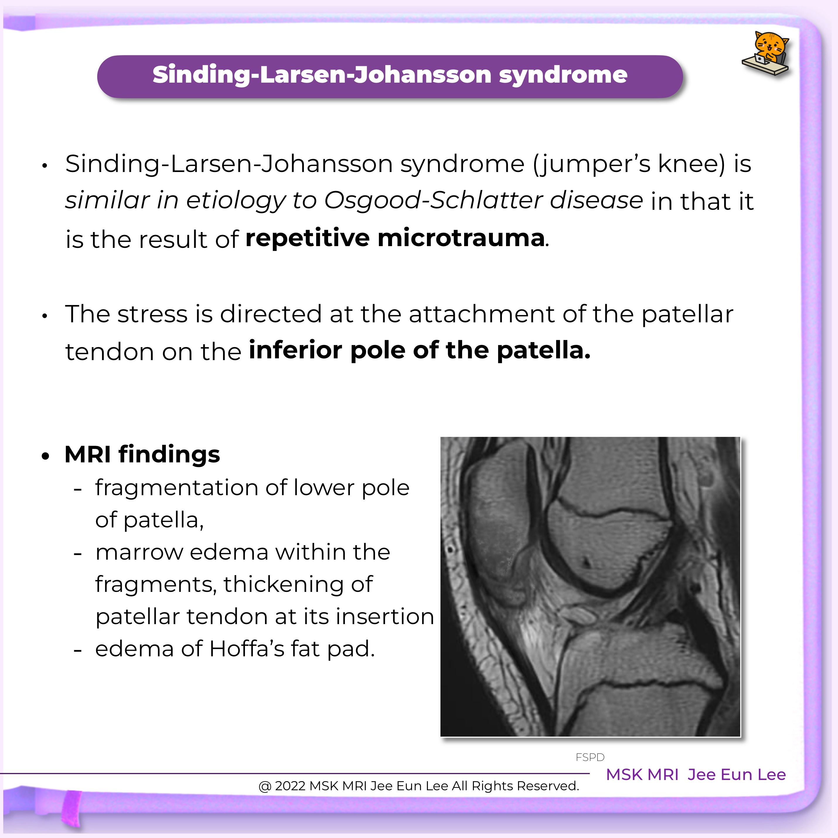Sinding Larsen Johansson Syndrome (SLJS) is a juvenile osteochondrosis and traction epiphysitis affecting the extensor mechanism of the knee