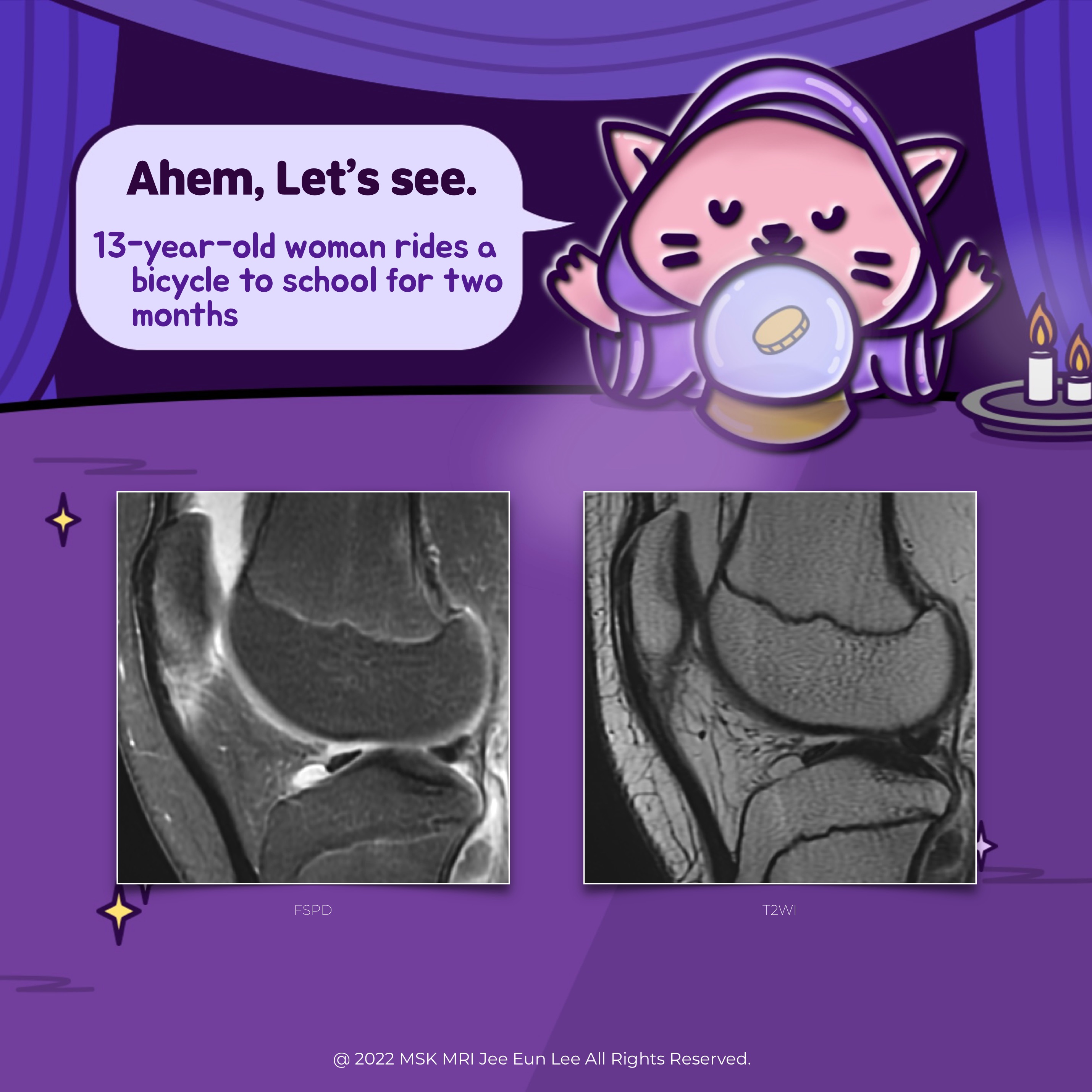 A 13-year-old girl rode her bike 30 minutes a day to school for two months with anterior knee pain without any history of direct trauma.