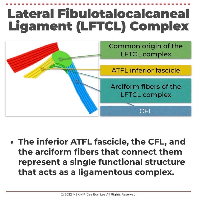 The superior fascicle of the ATFL is a distinct anatomical structure, whereas the inferior ATFL fascicle and the CFL share some features being both isometric ligaments, having a common fibular insertion, being connected by arciform fibers, and forming a functional and anatomical entity, that has been named the lateral fibulotalocalcaneal ligament (LFTCL) complex.