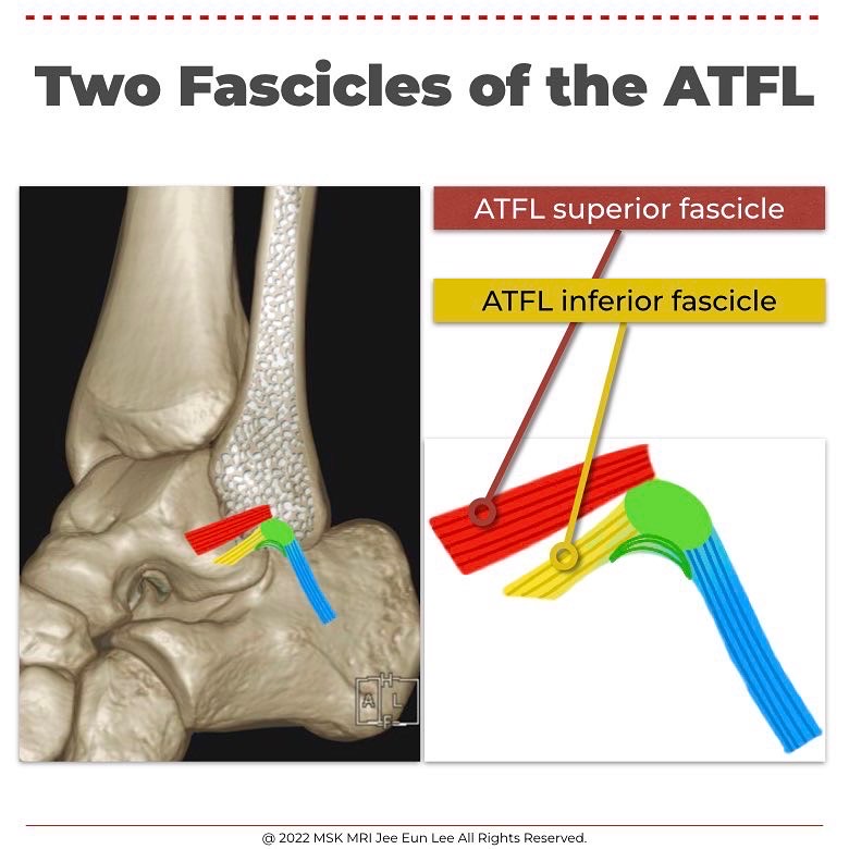The ATFL superior fascicle inserts at the body–neck junction of the talus and it is an intraarticular structure of the ankle, whereas the ATFL inferior fascicle inserts more plantarly in the talar body and it is an extra-articular structure.