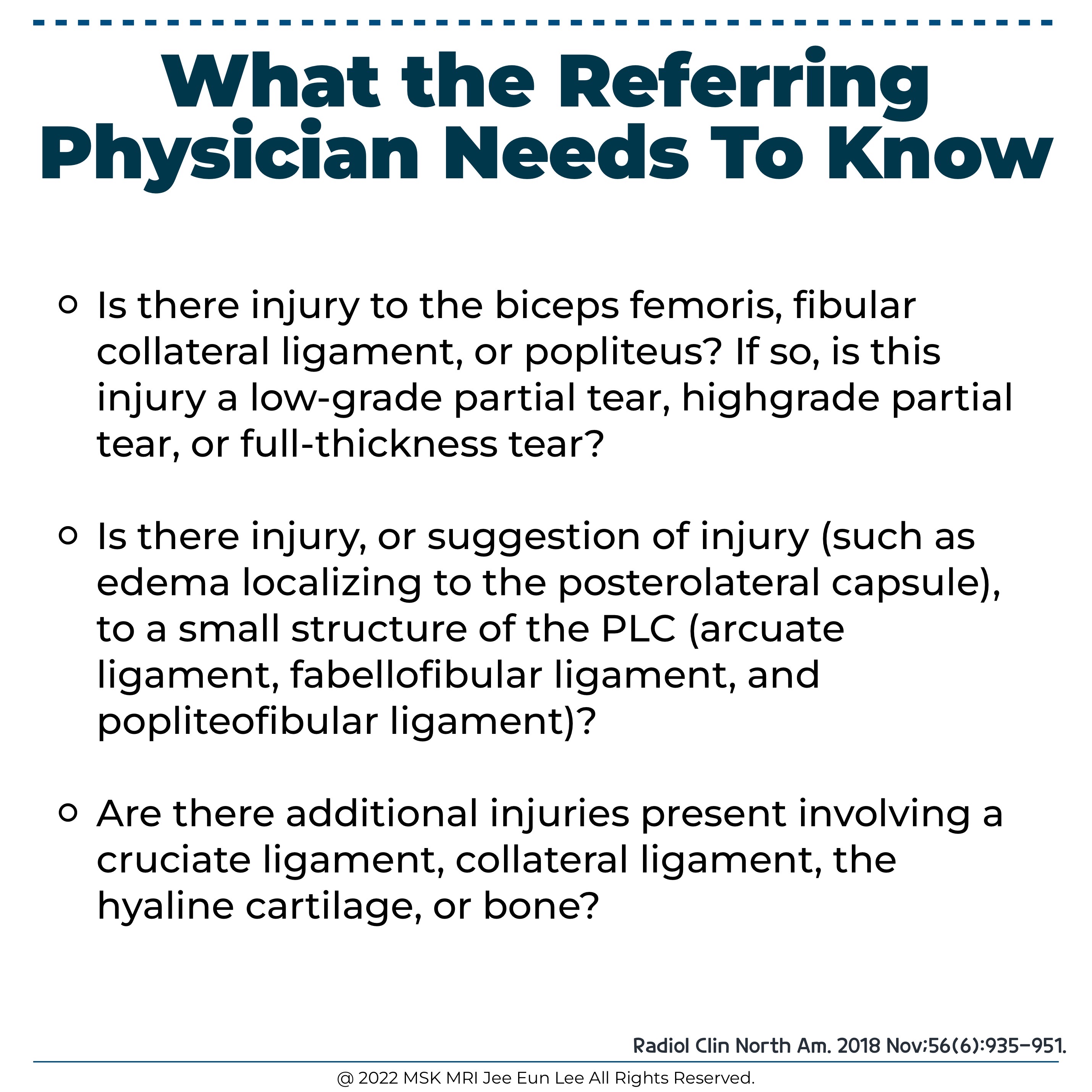 The investigators concluded that although MR imaging assessment of the PLC injury is challenging due to anatomic complexity, the larger structures are easy to evaluate with standard MR technique, and direct visualization of small structure involvement on MRI is not necessary to report a clinically unstable PLC injury.