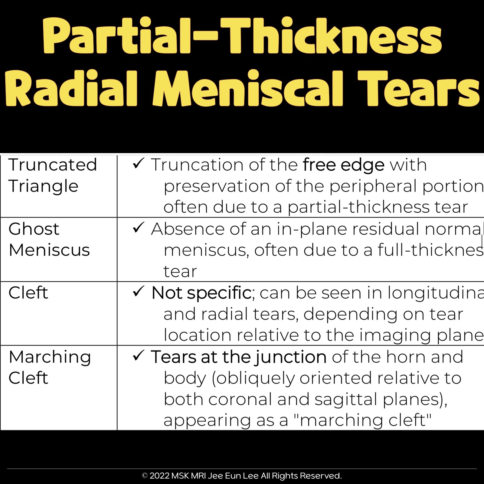 ๐ก Radial tears are crucial in musculoskeletal radiology, affecting the knee’s biomechanical integrity.