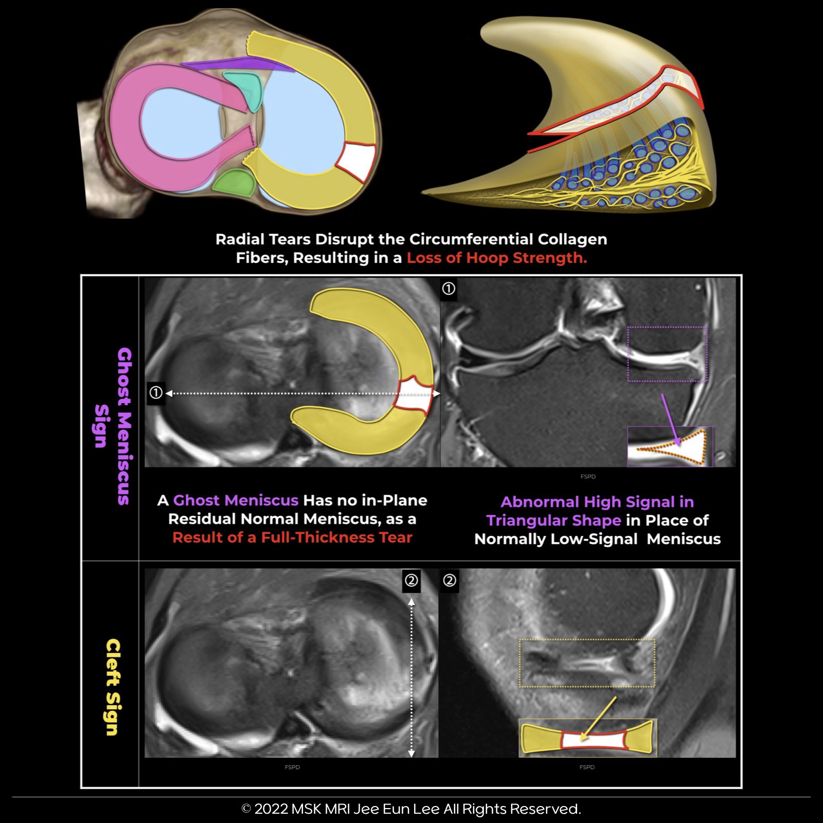 • Unlike horizontal and longitudinal tears, radial tears significantly disrupt meniscal hoop strength.