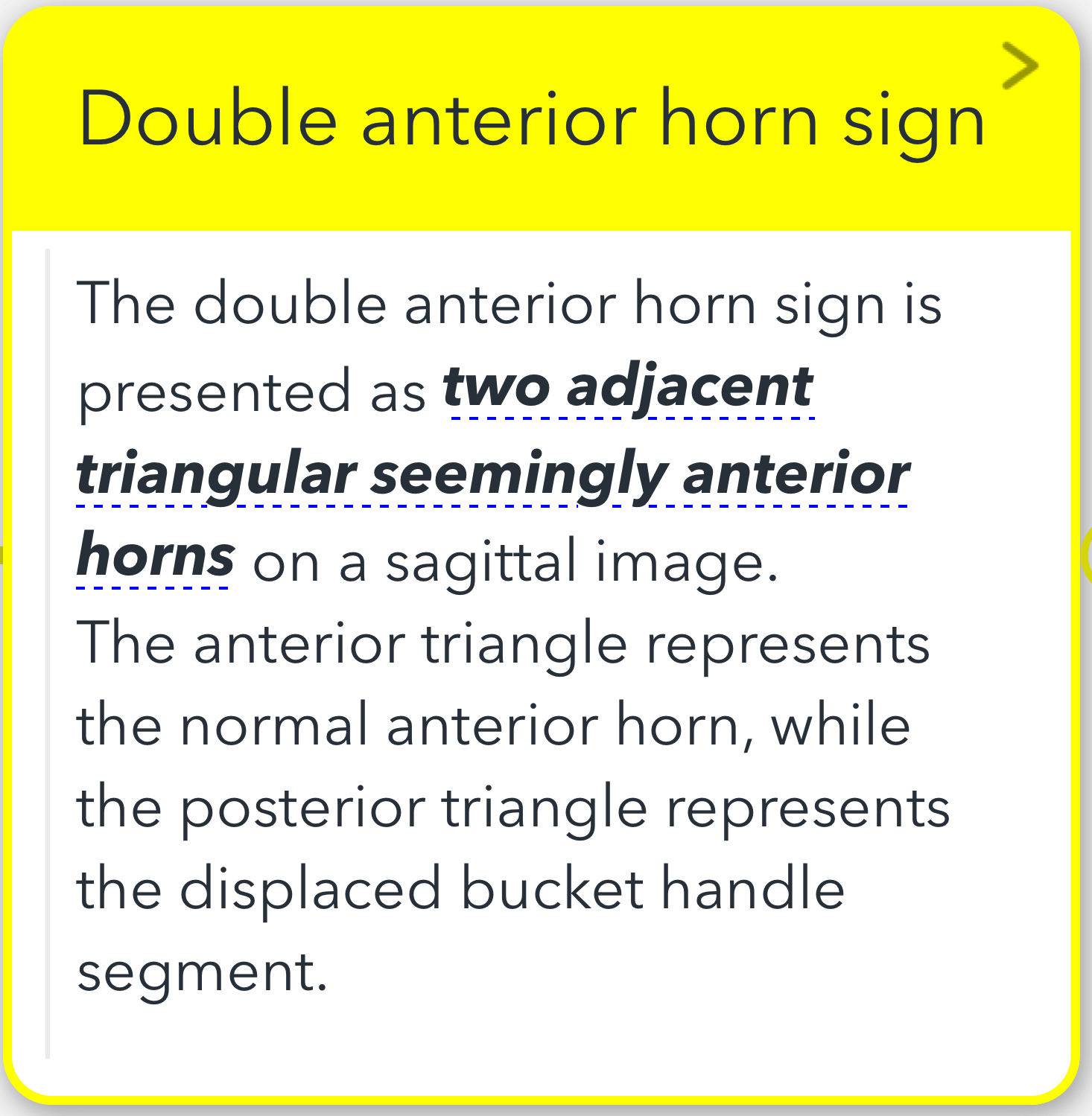 The double anterior horn sign is presented as two adjacent triangular seemingly anterior horns on a sagittal image.