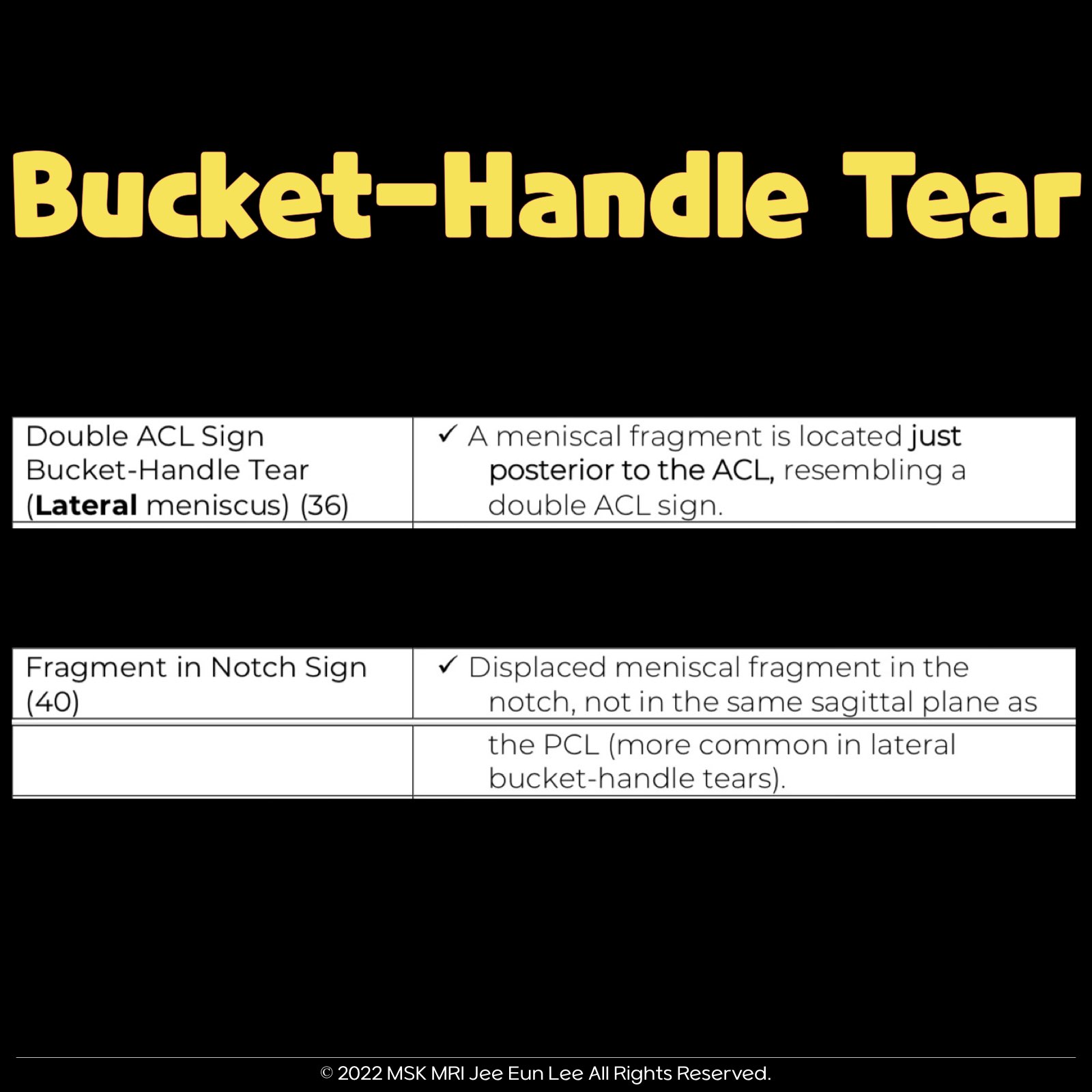 - However, it's crucial to remember that while these signs are sensitive and helpful, they are not entirely specific to bucket-handle tears.