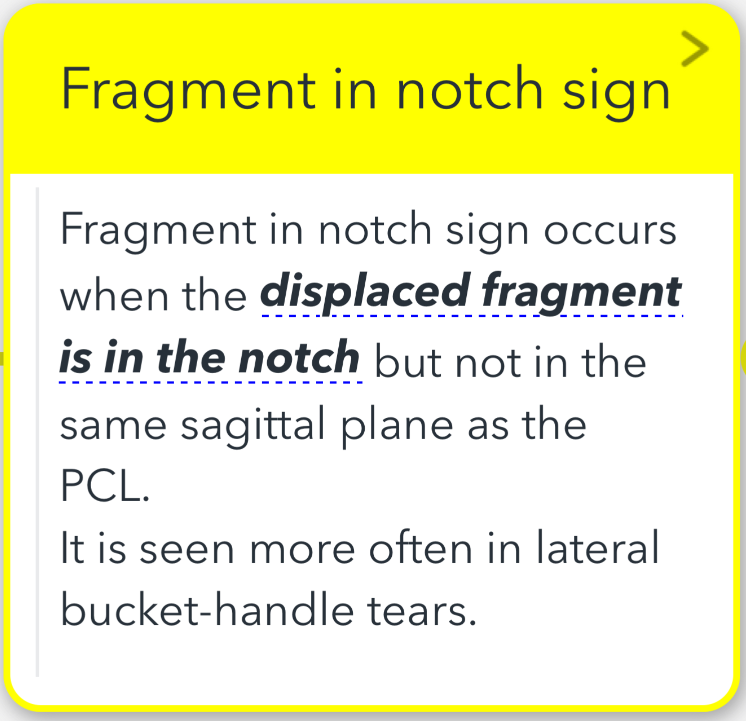It's worth noting that other conditions, such as flap tears that are displaced toward the intercondylar notch, can also exhibit a "Fragment in Notch Sign." Therefore, seeing this sign should not automatically lead to the assumption that the meniscal tear is a bucket-handle tear.