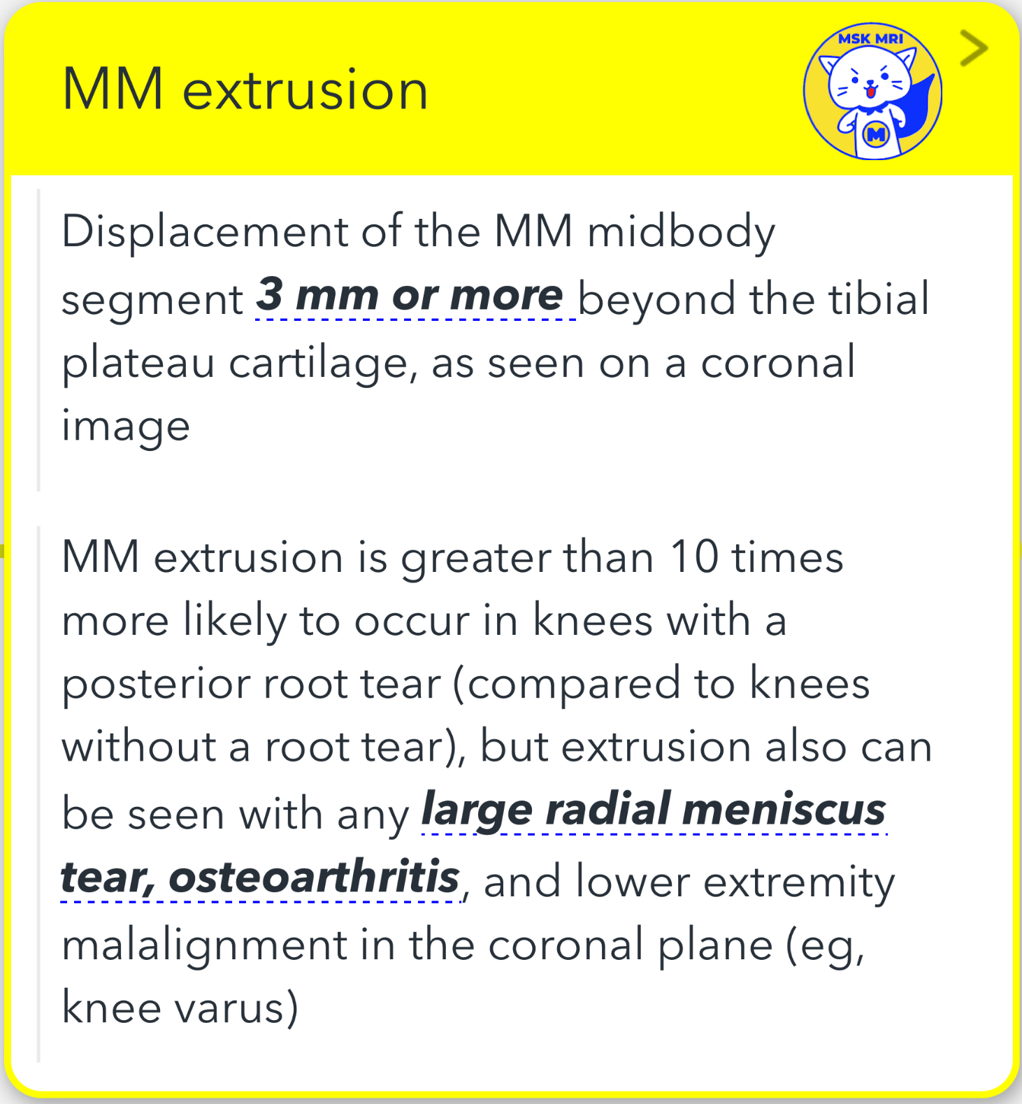 - MM extrusion refers to the displacement of the midbody segment of the medial meniscus by 3 mm or more beyond the tibial plateau cartilage, as visualized on a coronal image.