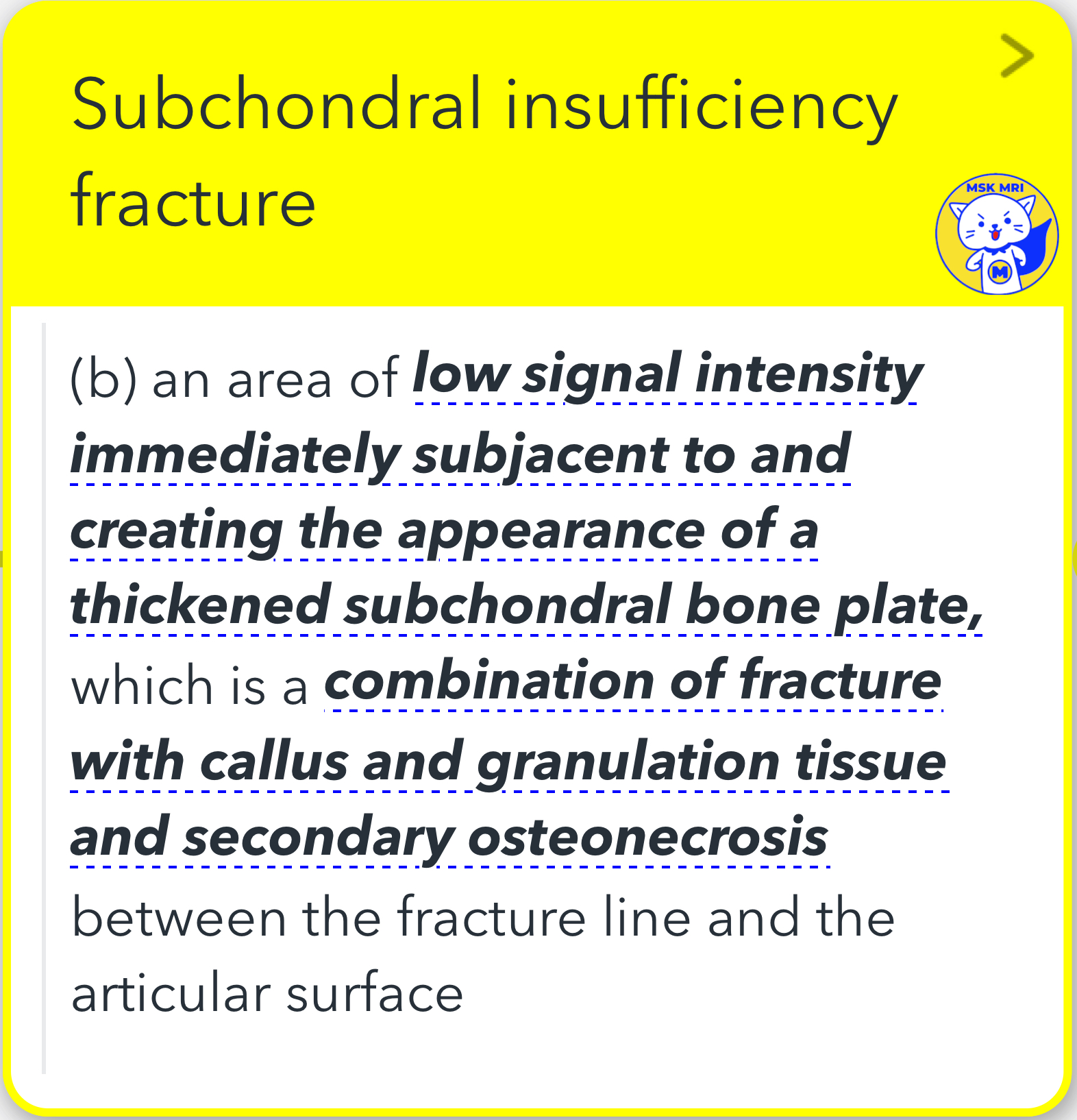 - There are two key components: a) A hypointense line in the subarticular marrow, often irregular or discontinuous, parallel to the subchondral bone plate. b) An area of low signal intensity immediately below, creating a thickened subchondral bone plate appearance. This includes a combination of fracture with callus, granulation tissue, and secondary osteonecrosis between the fracture line and the articular surface.