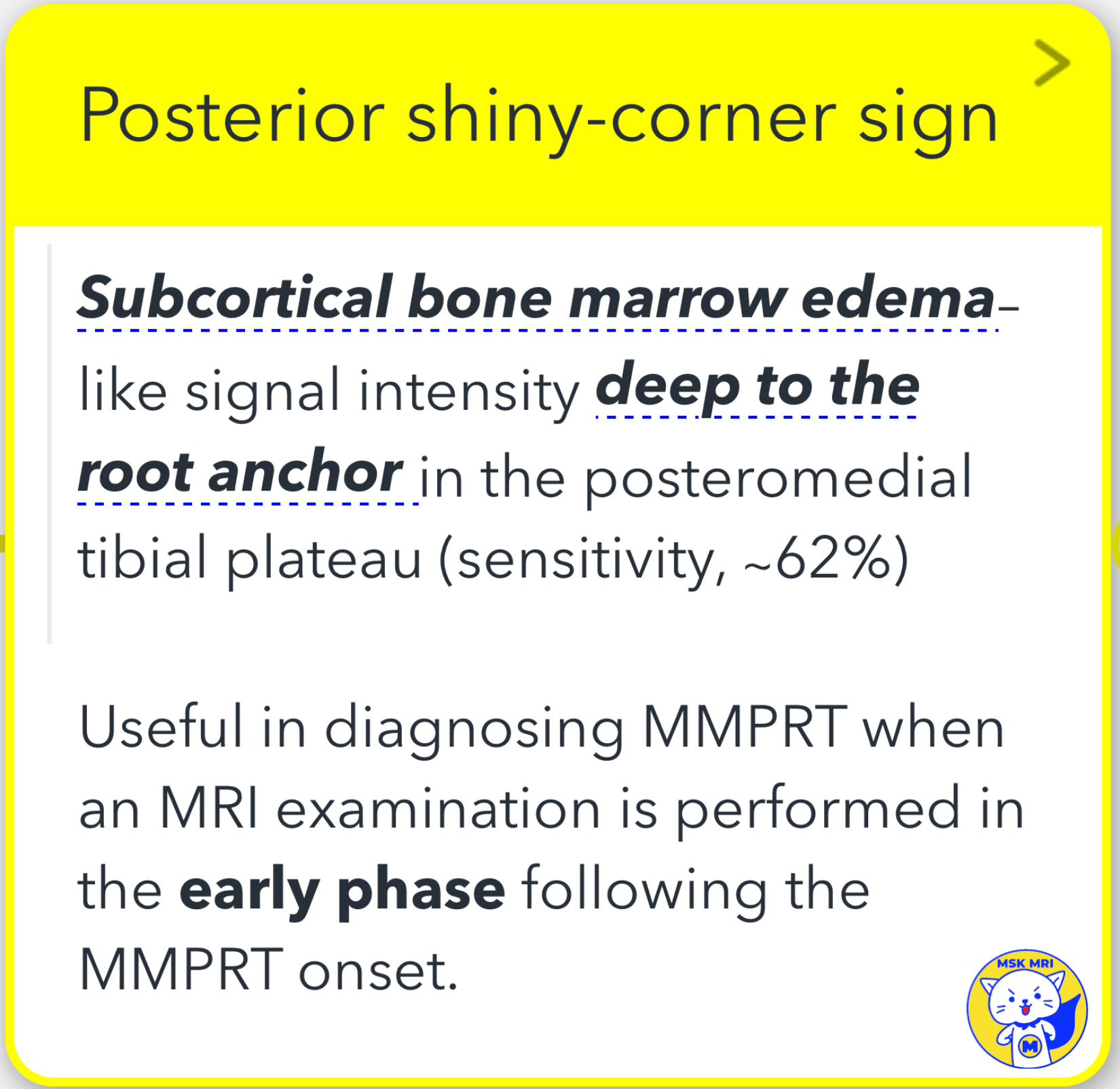 - It's a useful diagnostic tool, especially when performing an early-phase MRI examination following the onset of a medial meniscus posterior root tear (MMPRT).