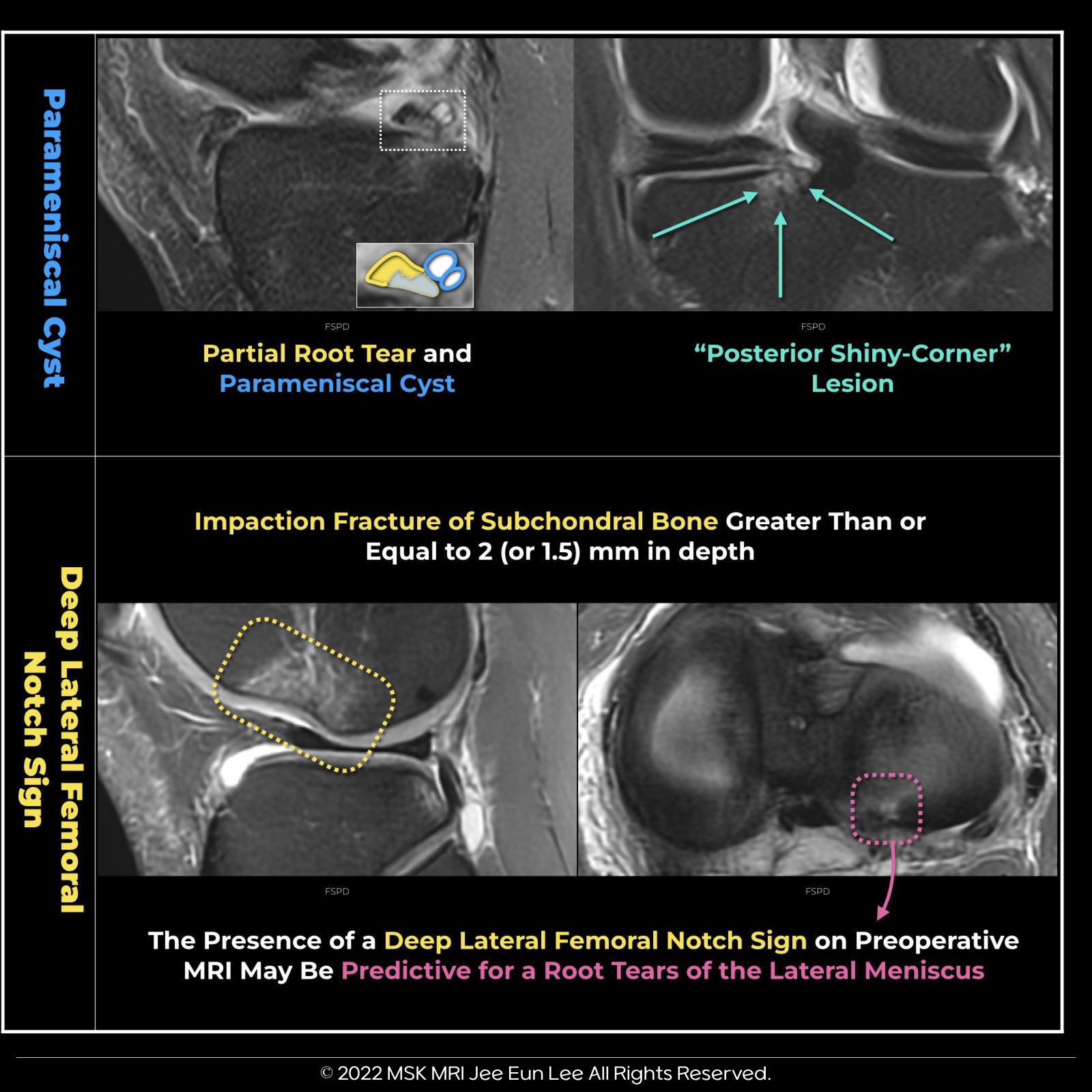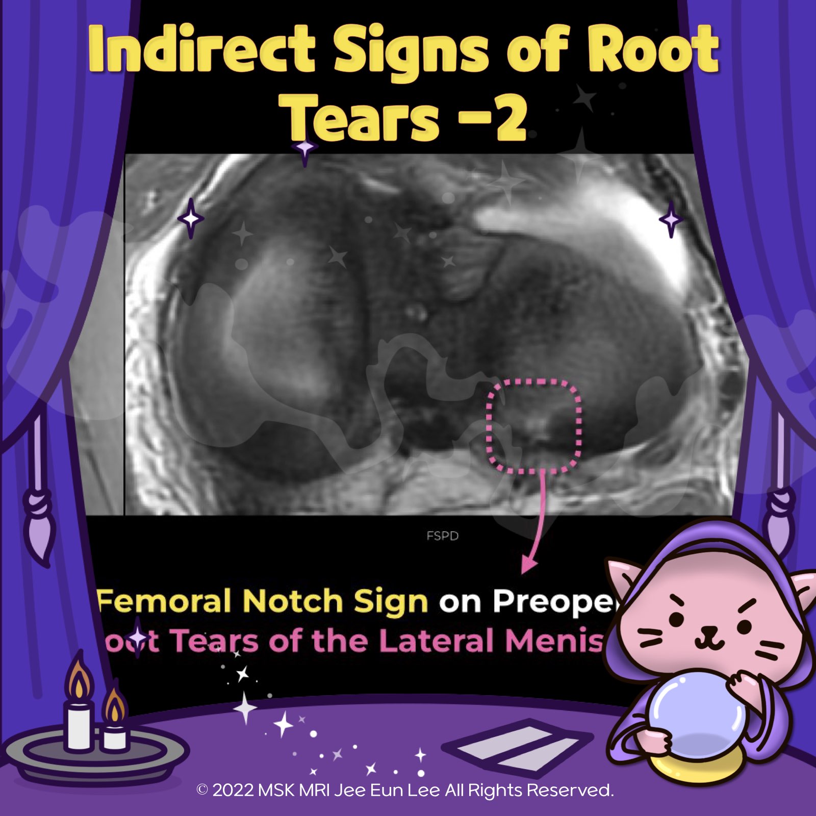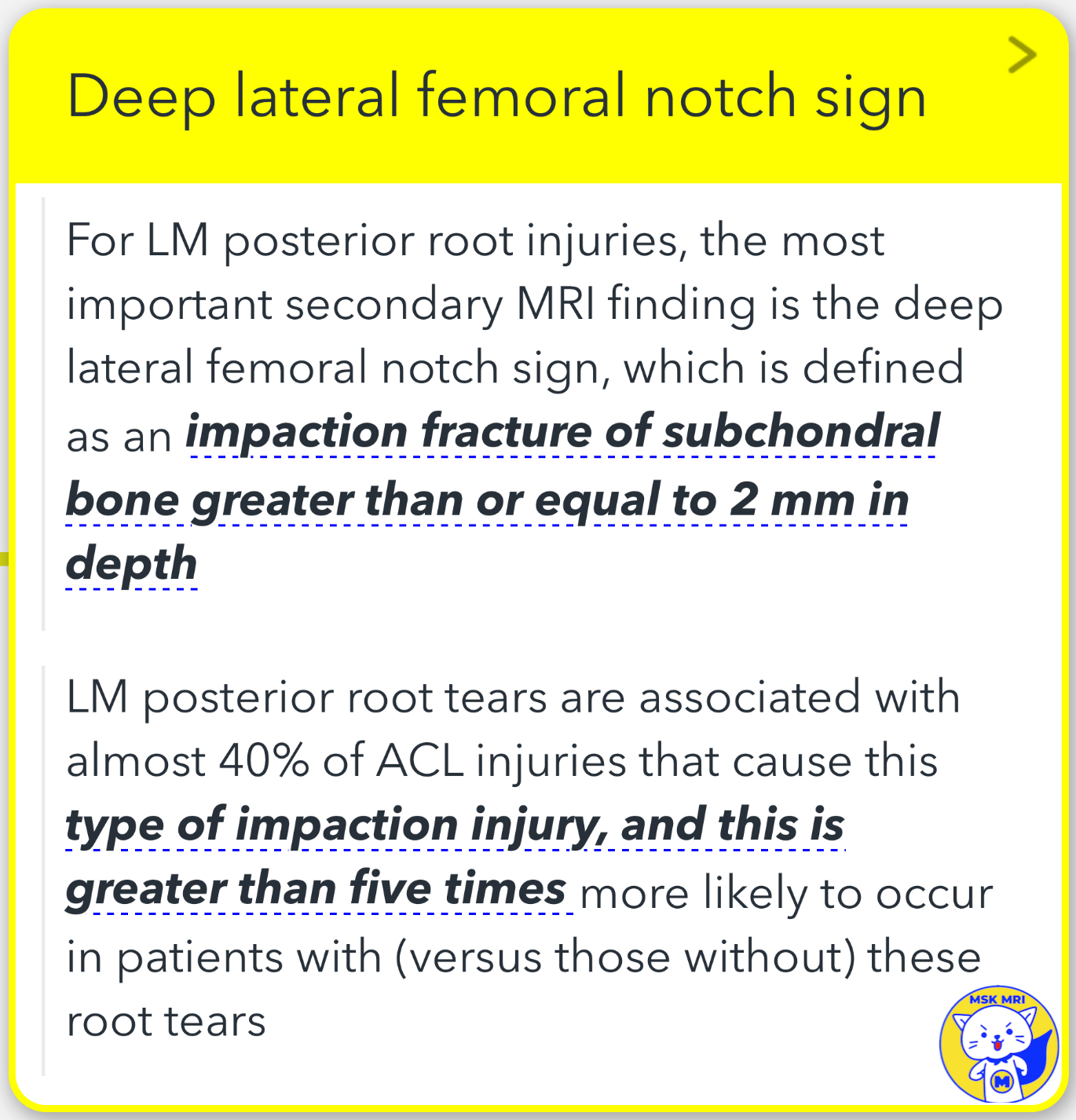 - In cases of lateral meniscus (LM) posterior root injuries, the primary secondary MRI finding of significance is the "deep lateral femoral notch sign."