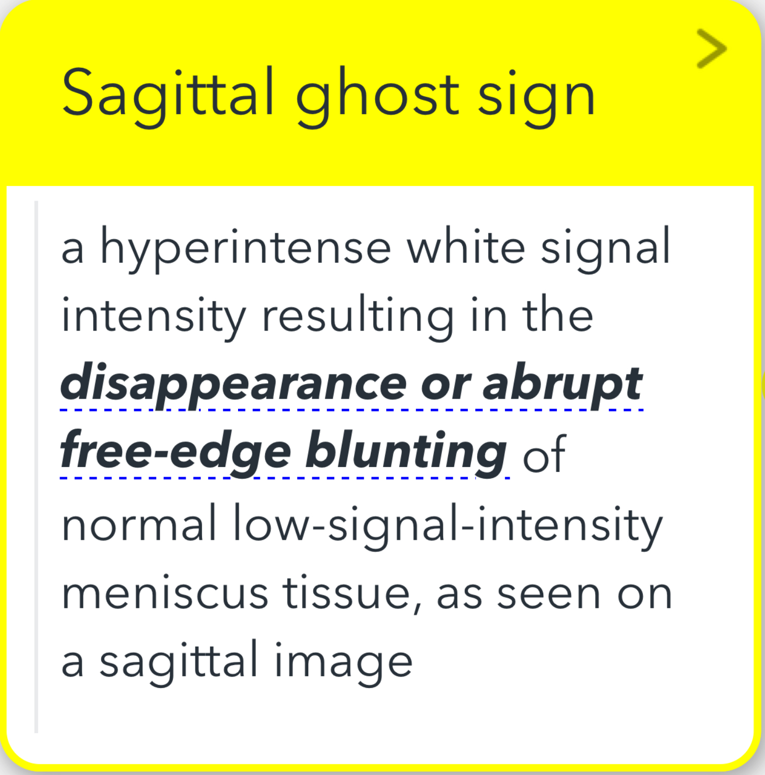 - This sign is characterized by a hyperintense white signal intensity that leads to the disappearance or abrupt blunting of the normal low-signal-intensity meniscus tissue. It is typically observed on a sagittal image.