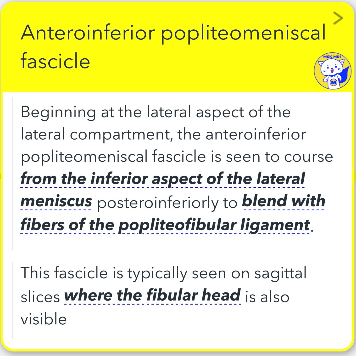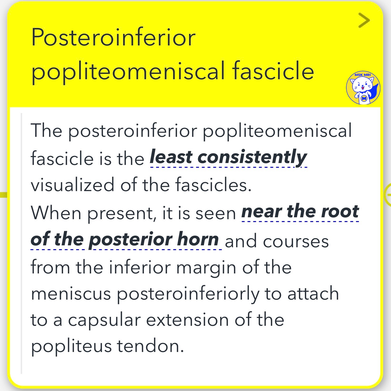 3️⃣Posteroinferior Popliteomeniscal Fascicle: This is the least consistently visualized fascicle. When it is visible, it can be found near the root of the posterior horn, traveling from the meniscus's inferior margin posteroinferiorly to attach to a capsular extension of the popliteus tendon.