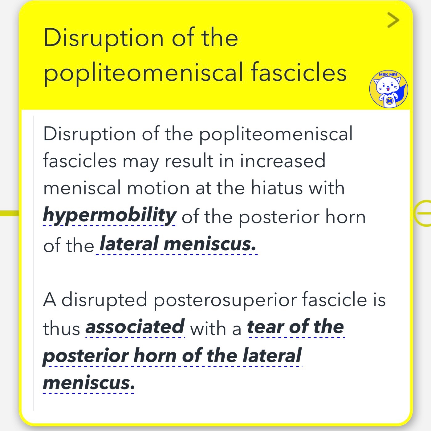 - A disruption of the popliteomeniscal fascicles can lead to increased motion of the meniscus at the hiatus, particularly causing hypermobility of the posterior horn of the lateral meniscus.