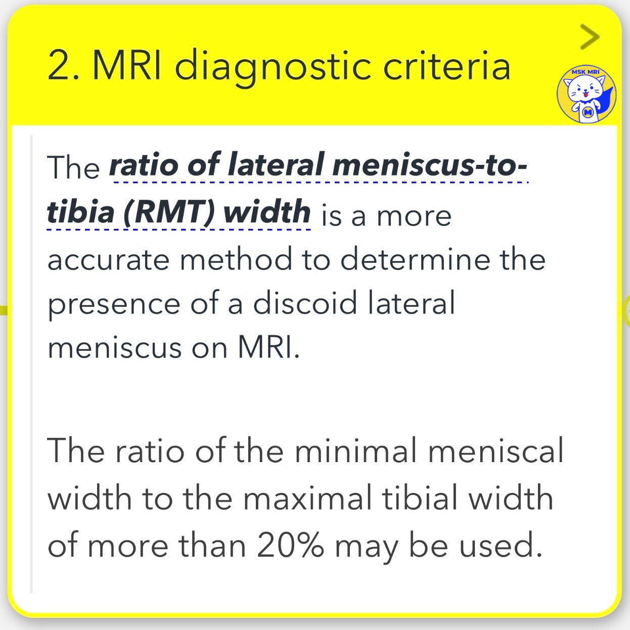 - The ratio of lateral meniscus-to-tibia (RMT) width is a more accurate method to determine the presence of a discoid lateral meniscus on MRI.