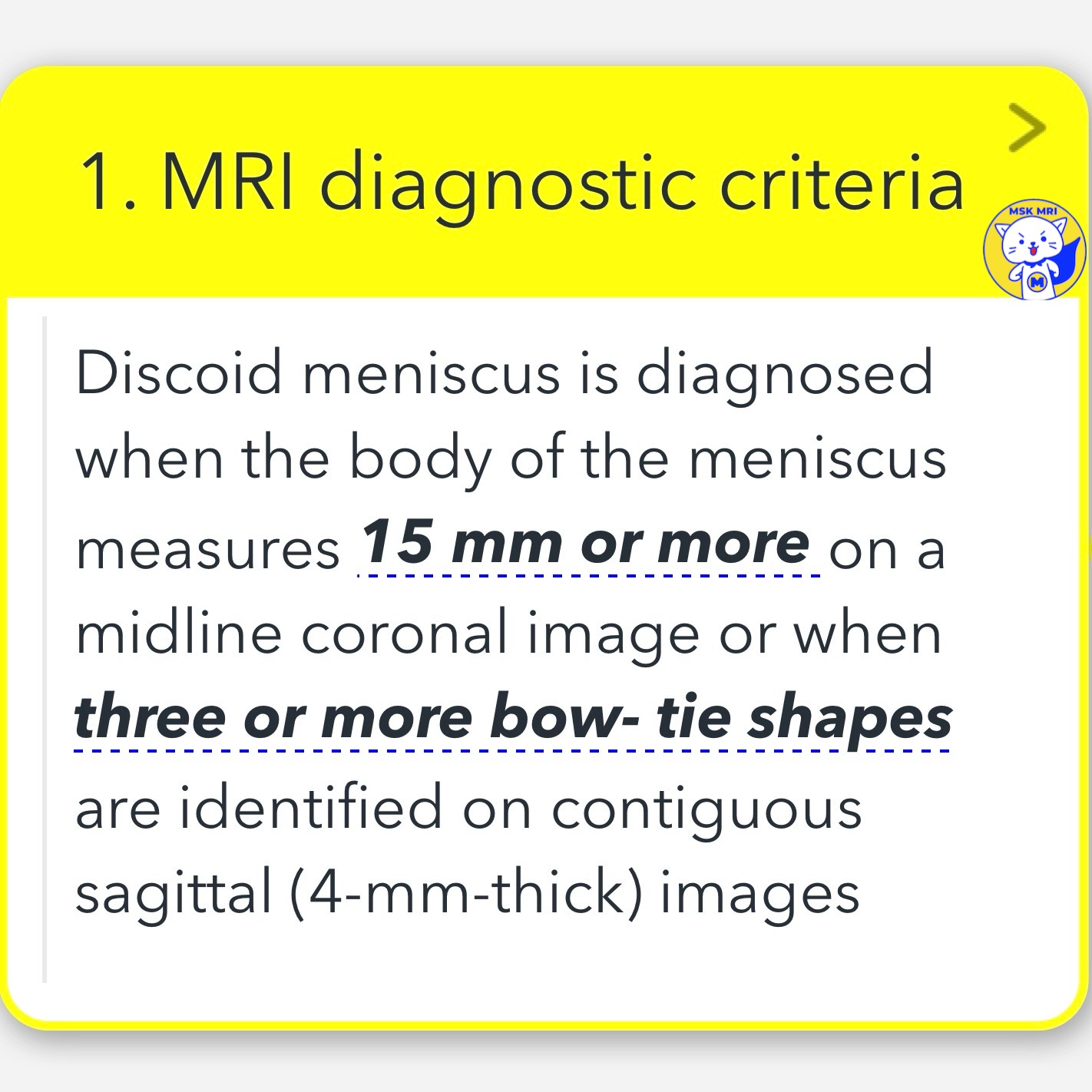 - Discoid meniscus is diagnosed when the body of the meniscus measures 15 mm or more on a midline coronal image or when three or more bow-tie shapes are identified on contiguous sagittal (4-mm-thick) images