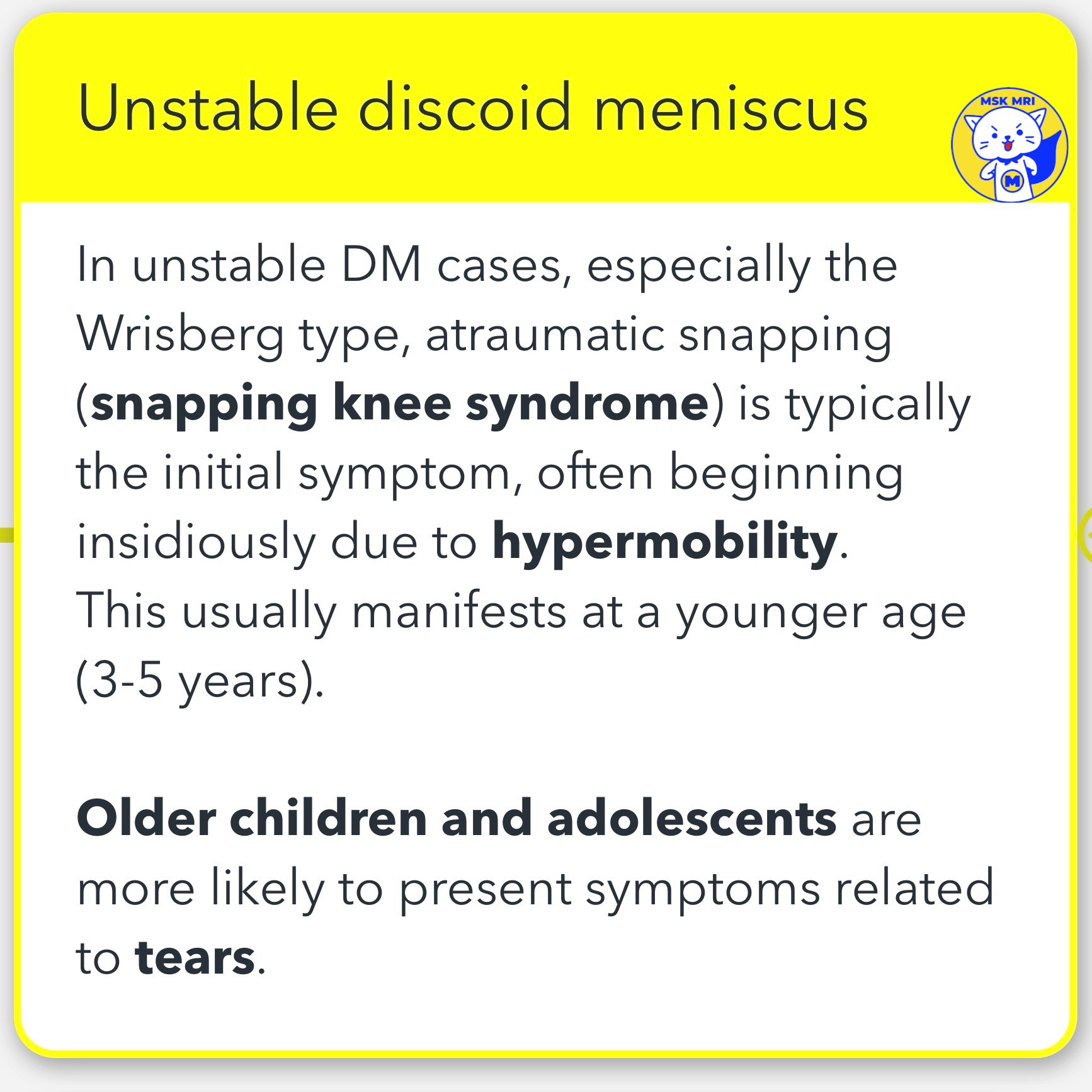 - Symptoms: In unstable DM cases, including the Wrisberg type, symptoms typically include atraumatic snapping of insidious onset (snapping knee syndrome), presenting at a younger age (3–5 years). Older children and adolescents often present with tear-related symptoms.